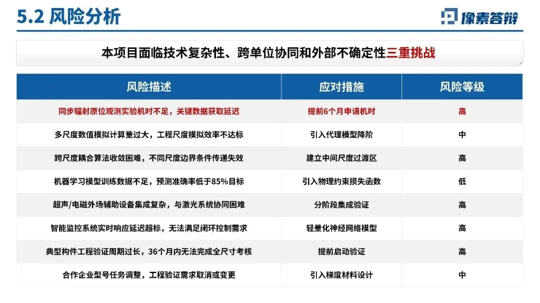 内容逻辑采用闭环式叙事,严格遵循材料工程科研范式,以五大课题并行递进结构梳理研究全链条,坚持单页单主题,从裂纹萌生机理、多尺度数值模拟,到工艺优化、在线监测、工程修复,逻辑环环相扣,评审一眼读懂核心脉络。