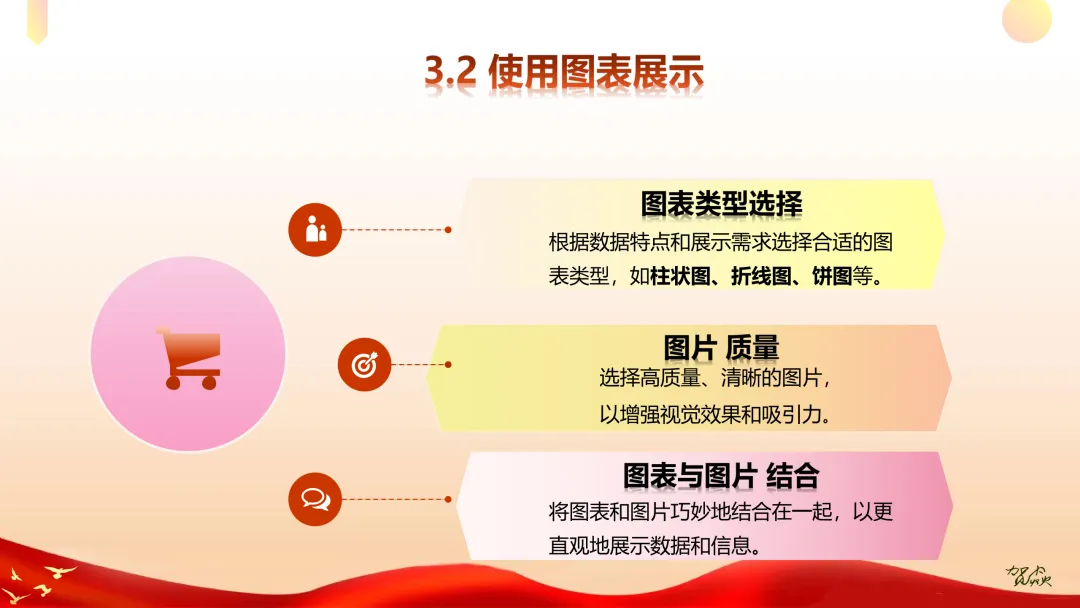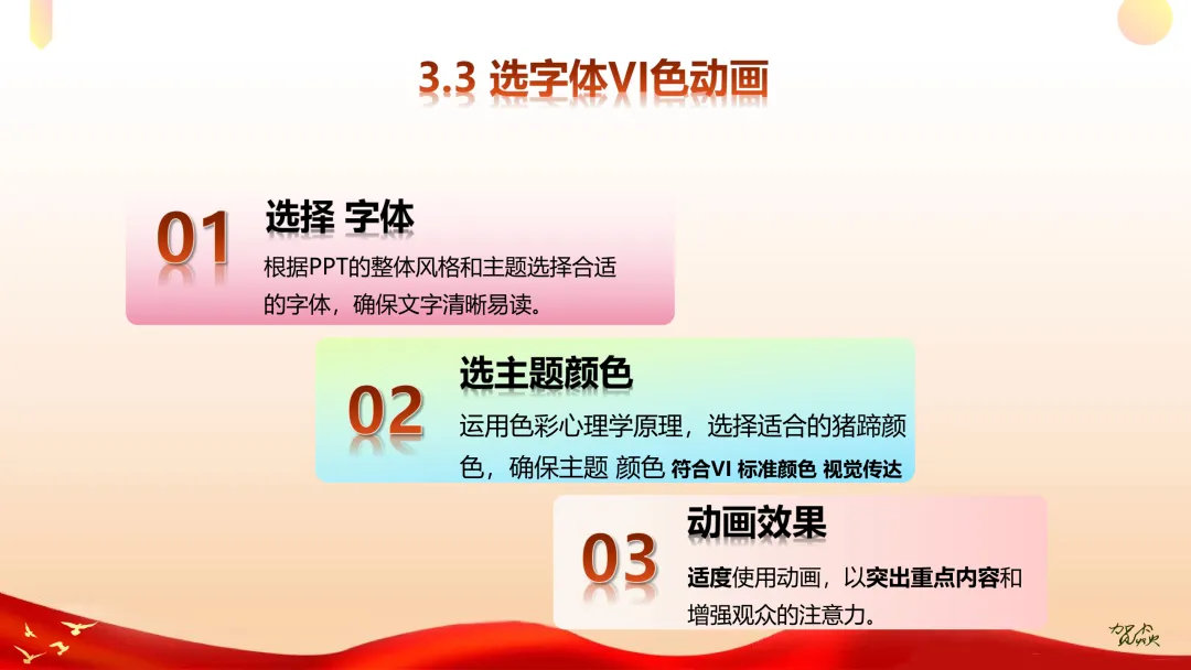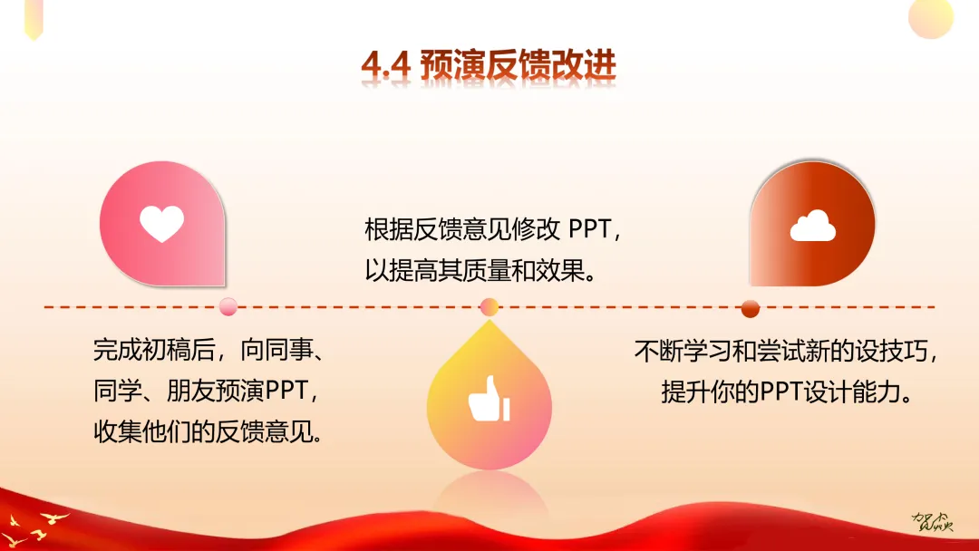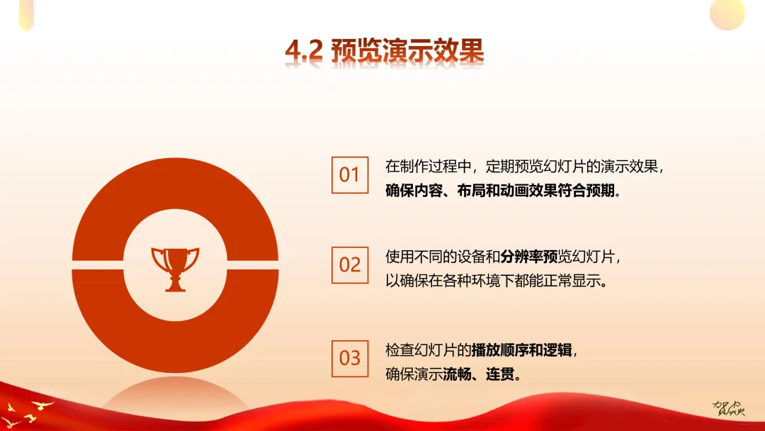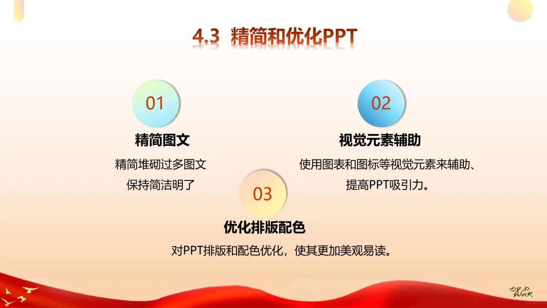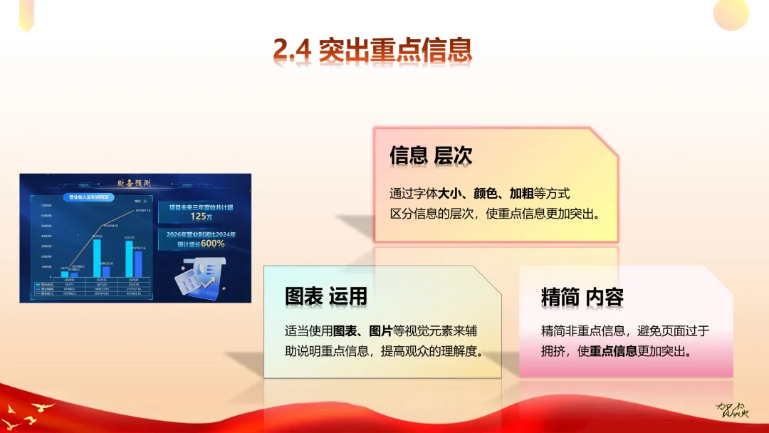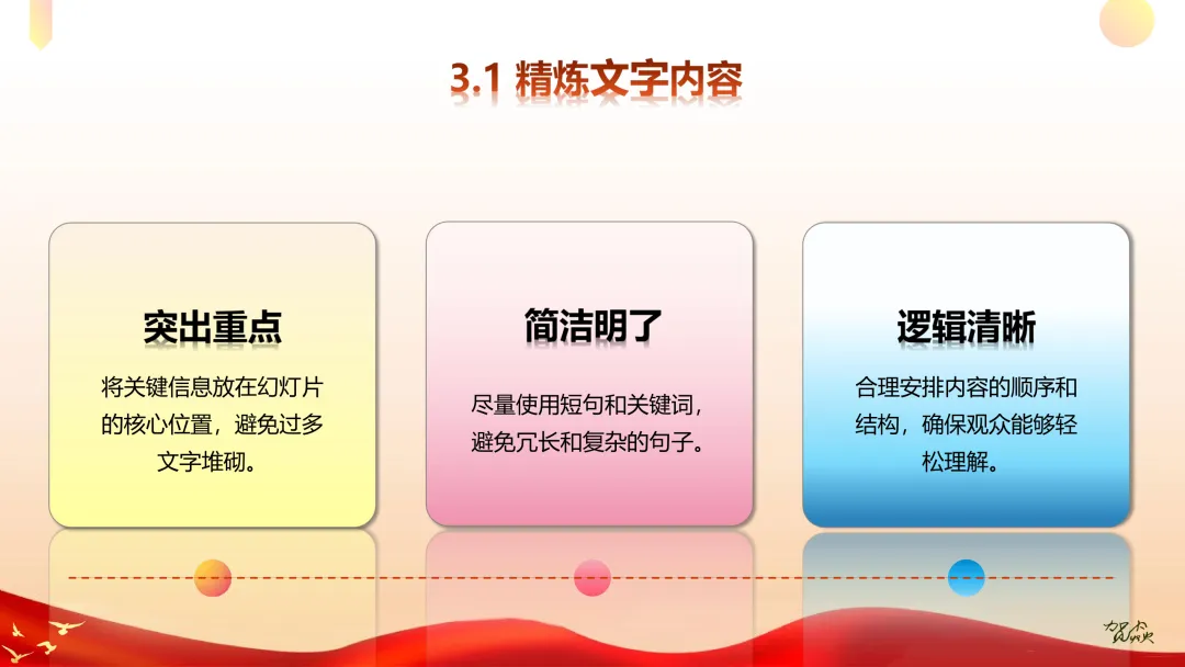 :文字要精炼,用短句关键词;选合适图表展示数据,结合高质量图片;字体、颜色、动画要协调,控制好字体大小、行距段距。