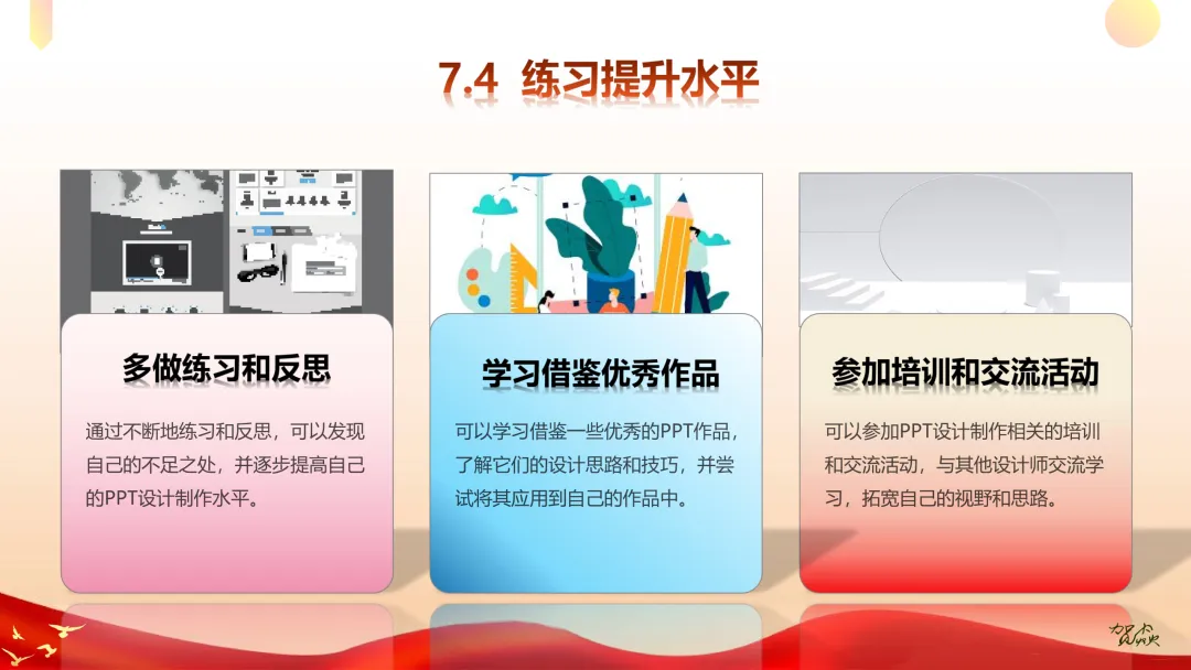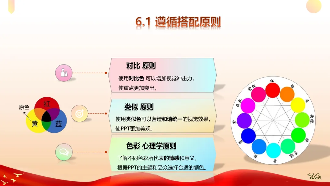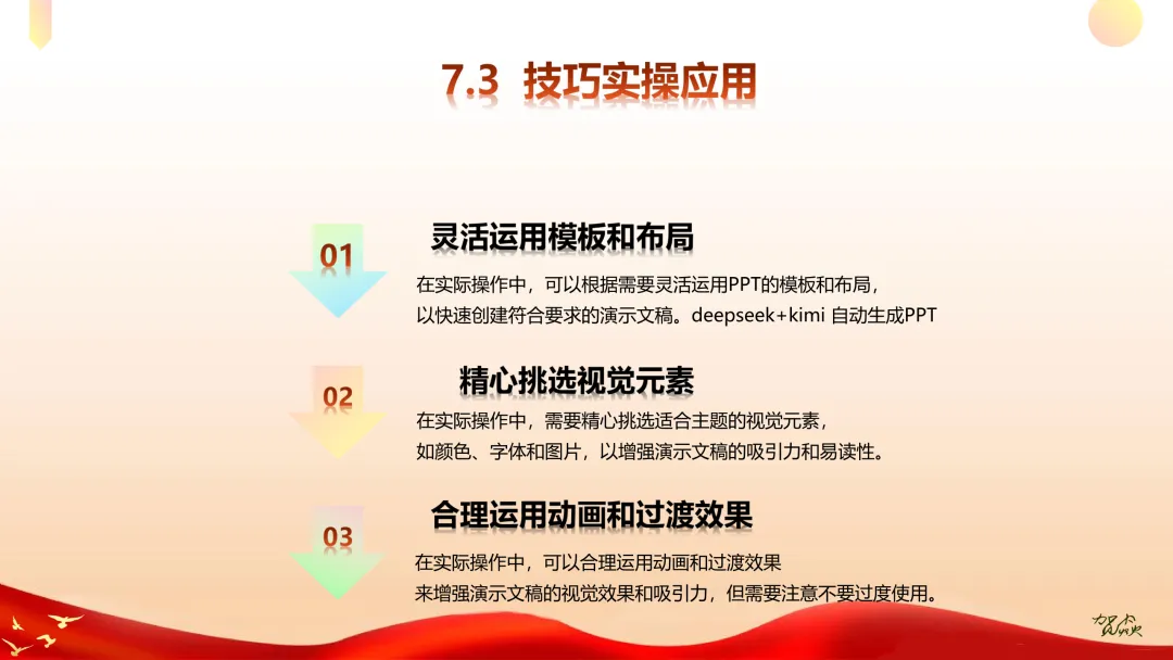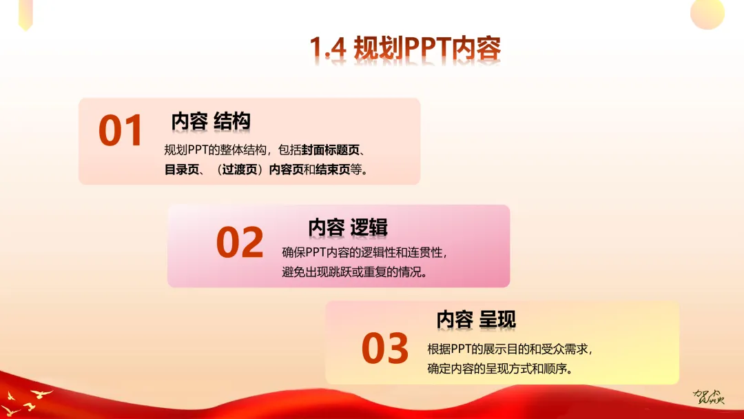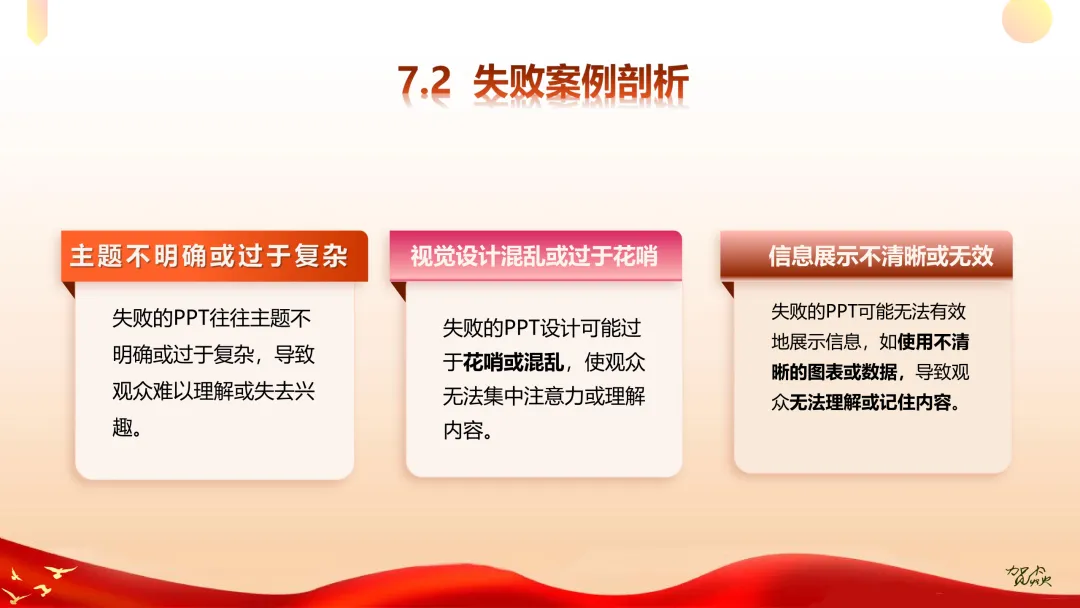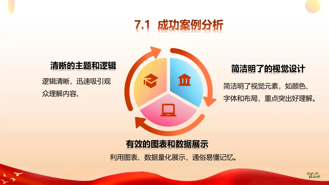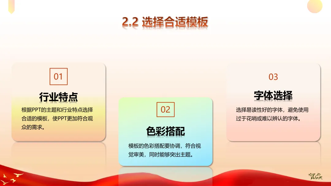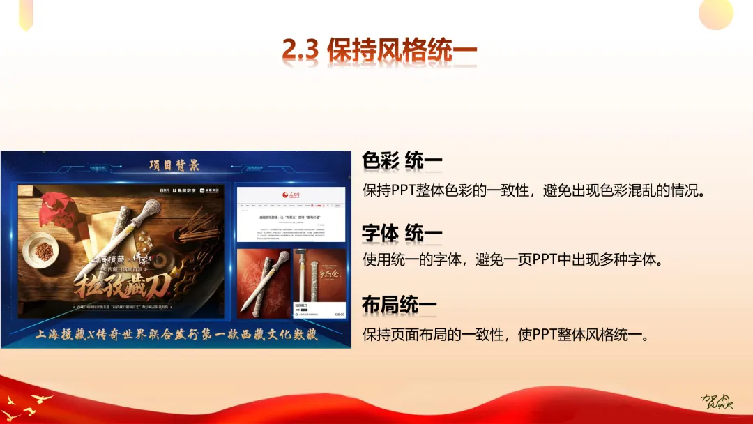 :文字要精炼,用短句关键词;选合适图表展示数据,结合高质量图片;字体、颜色、动画要协调,控制好字体大小、行距段距。