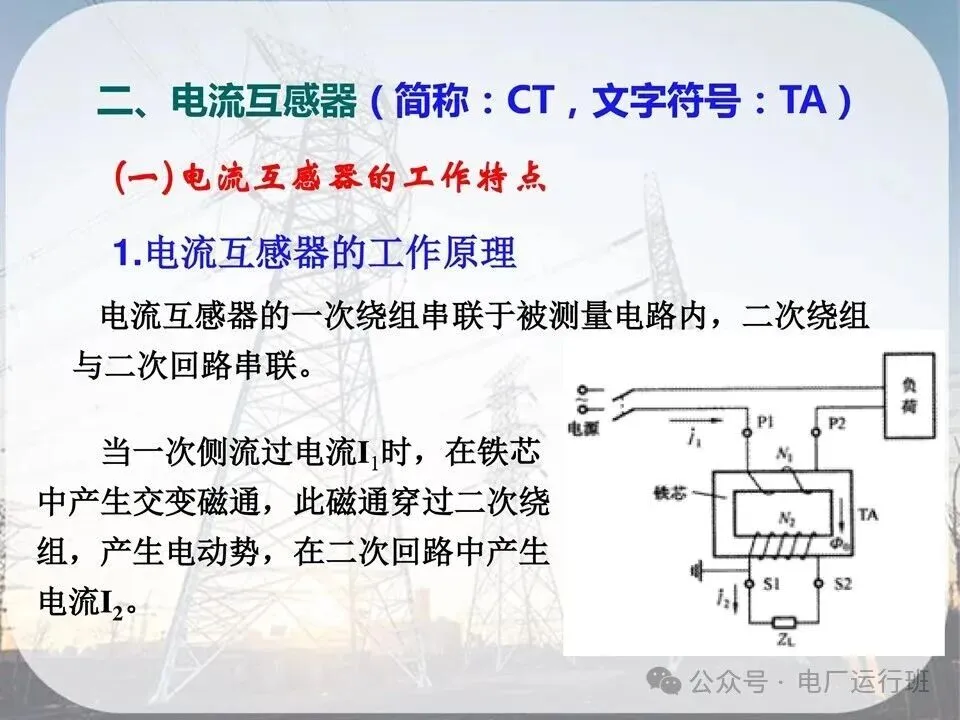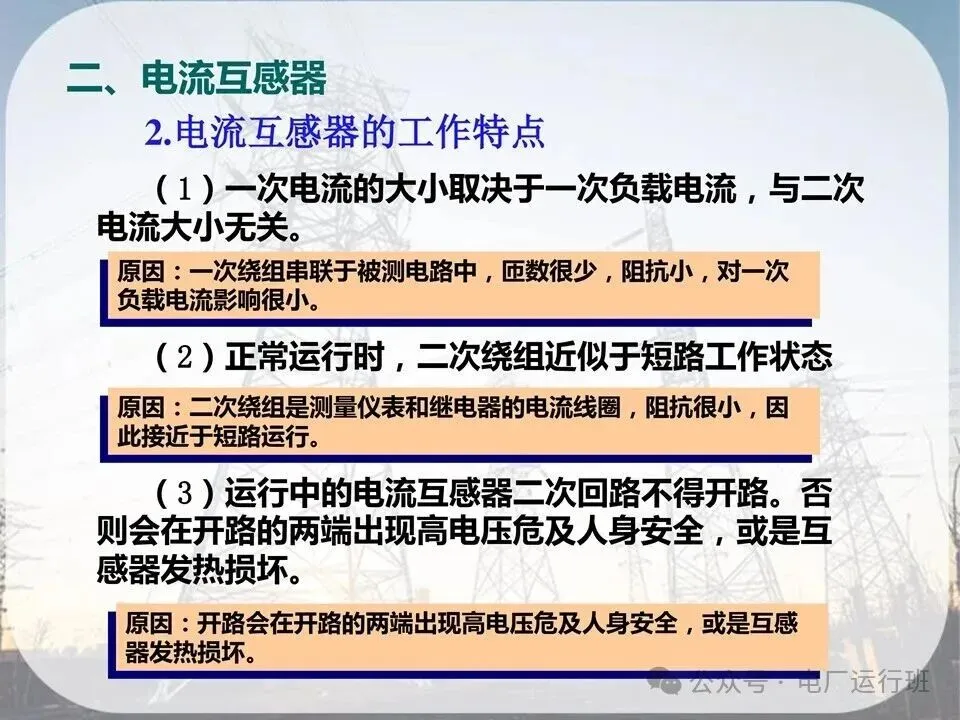 原因:二次绕组是测量仪表和继电器的电流线圈,阻抗很小,因此接近于短路运行。