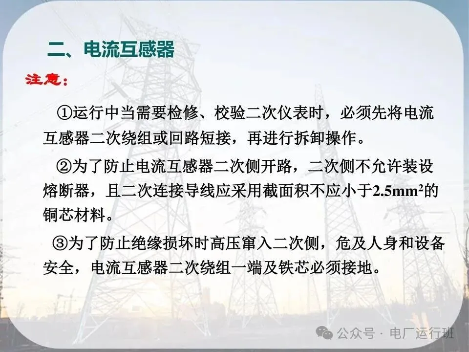 (3)运行中的电流互感器二次回路不得开路。否则会在开路的两端出现高电压危及人身安全,或是互感器发热损坏。