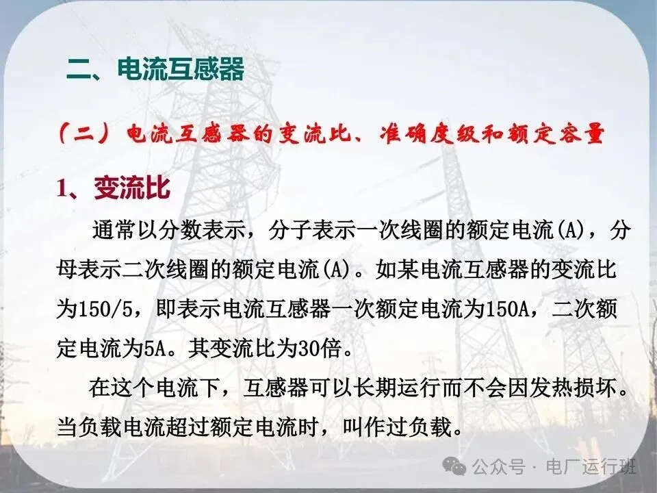 通常以分数表示,分子表示一次线圈的额定电流(A),分母表示二次线圈的额定电流(A)。如某电流互感器的变流比为150/5,即表示电流互感器一次额定电流为150A,二次额定电流为5A。其变流比为30倍。在这个电流下,互感器可以长期运行而不会因发热损坏当负载电流超过额定电流时,叫作过负载