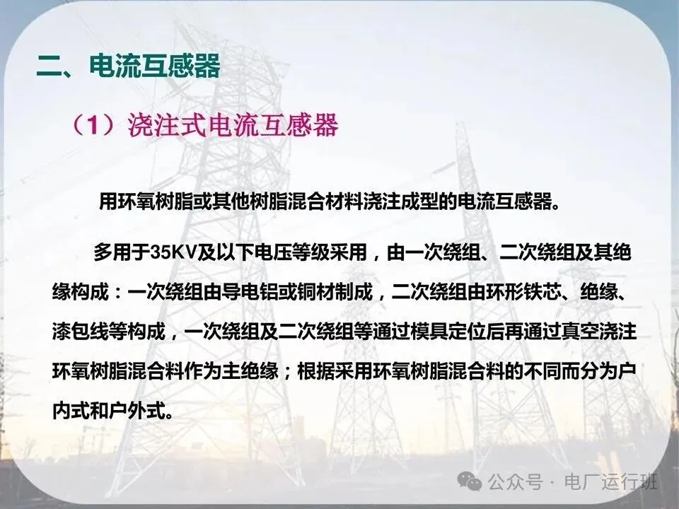 (4)电流互感器的一次绕组匝数少,截面积大,串联于被测量电路内:二次绕组匝数多,截面积小,与测量仪表和继电器的电流线圈串联。