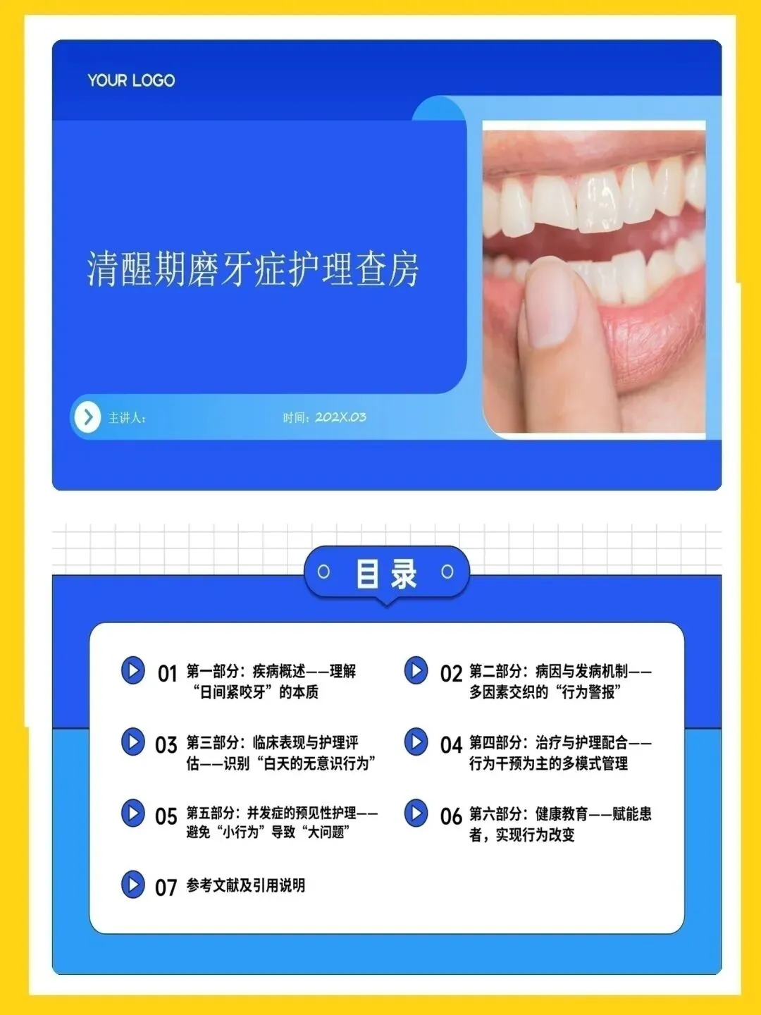 🍉名称:清醒期磨牙症护理查房带参考文献ppt模板