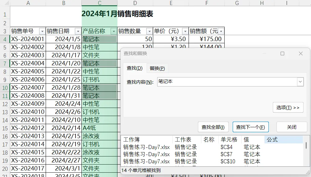 继续使用 “销售练习-我的名字.xlsx” 文件。今天我们会在“1月销售记录”工作表中,练习查找与替换的各种进阶技巧。