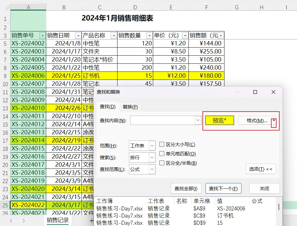 假设我们在第六天练习中给高于100的销售额标了红色背景,现在想把所有红色背景的销售额改成蓝色背景(同时可能修改内容)。