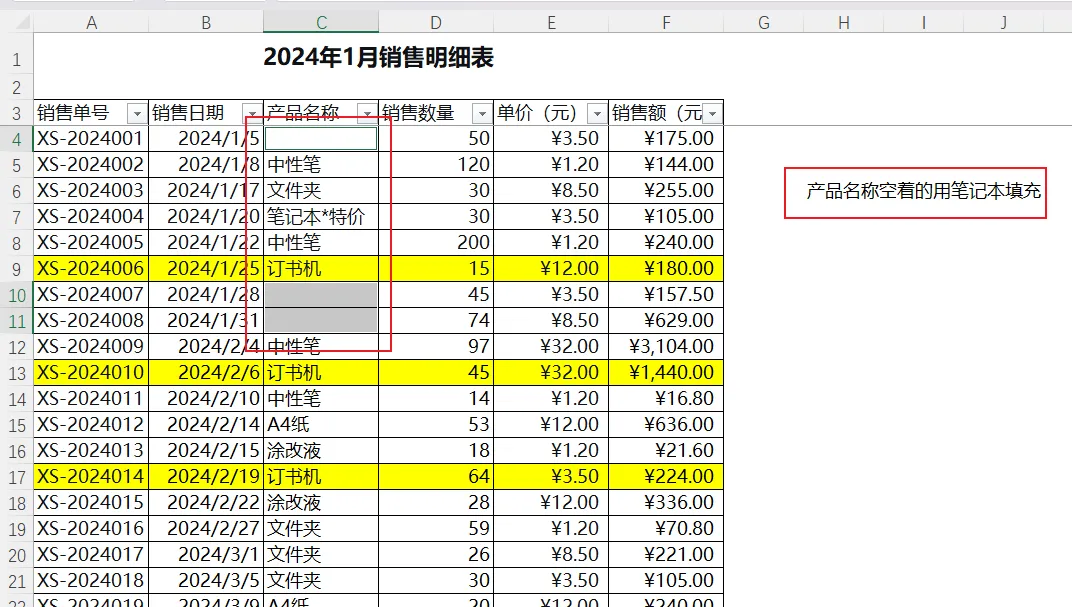 销售数据中,有些产品可能单价未填,导致销售额是空(或者有空白行)。假设“1月销售记录”中有几个空白的单元格,我们需要快速填充“待补充”。