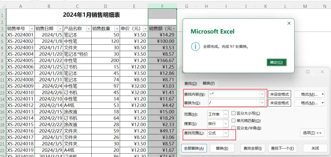 点击“全部替换”,Excel会把所有公式中的乘号换成除号。(因为我们F列是销售额=数量单价,改后会变成数量/单价,结果全错。所以这里只是演示,记得立即撤销Ctrl+Z)