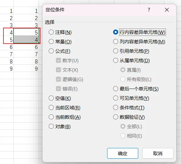 定位条件的妙用:定位条件中的“行内容差异单元格”“列内容差异单元格”可以快速对比两列数据找出不一致的项,非常实用。
