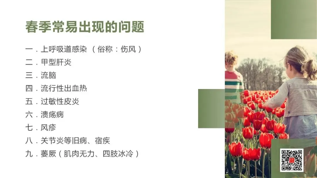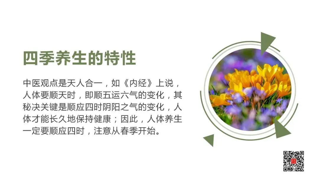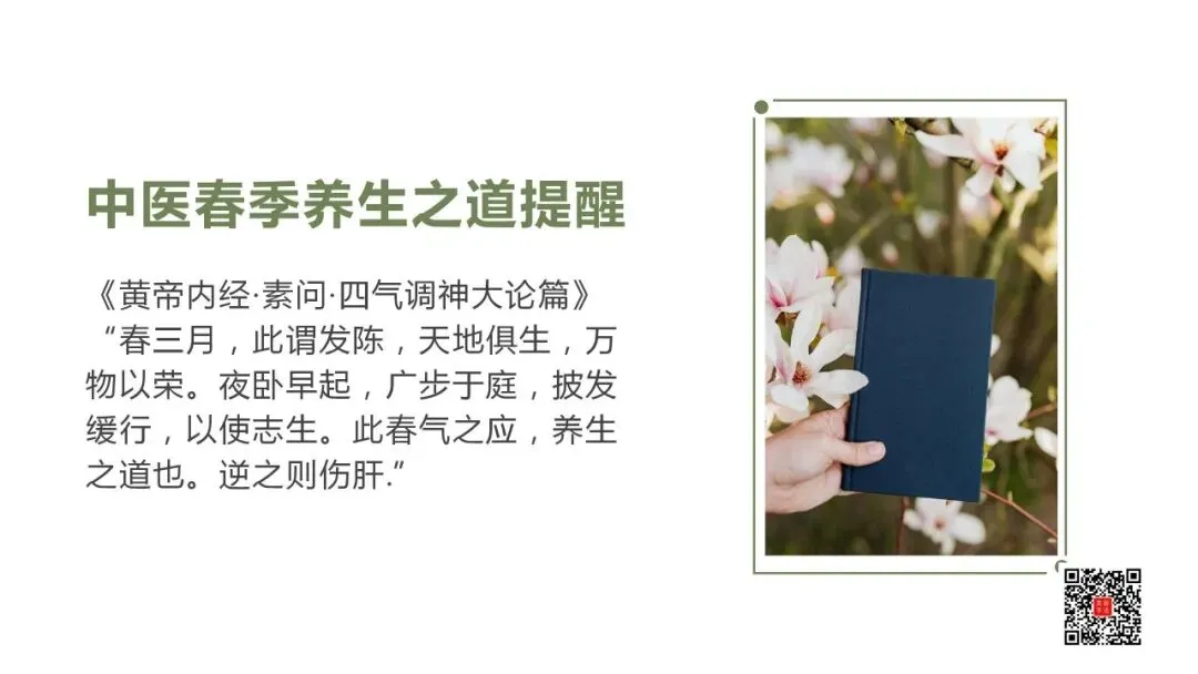 《黄帝内经·素问·四气调神大论篇》“春三月,此谓发陈,天地俱生,万物以荣。夜卧早起,广步于庭,披发缓行,以使志生。此春气之应,养生之道也。逆之则伤肝.”