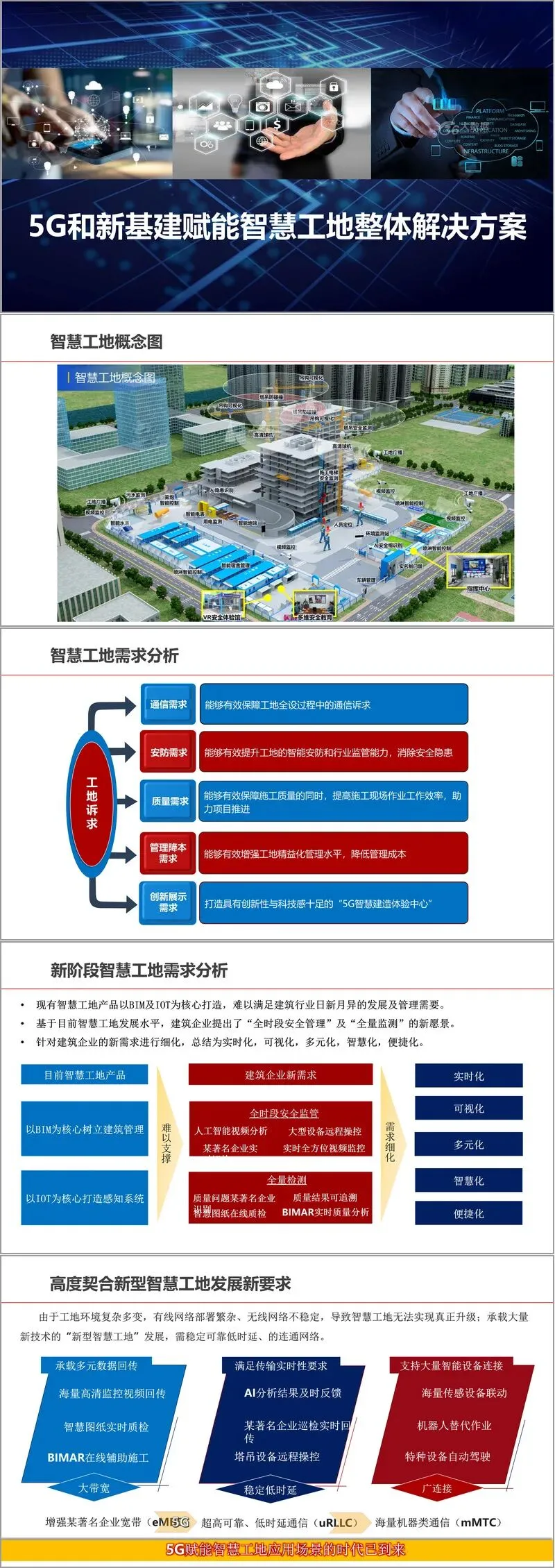 随着新基建的深入推进和5G技术的成熟应用,建筑行业正迎来智慧化转型的关键机遇。本文件系统阐述了以5G为核心的新型智慧工地整体解决方案,旨在回应建筑业日益增长的全时段安全管理、全量监测、实时化与智能化管理需求,推动工地从传统管理模式向科技驱动、数据赋能的现代化模式跃升。