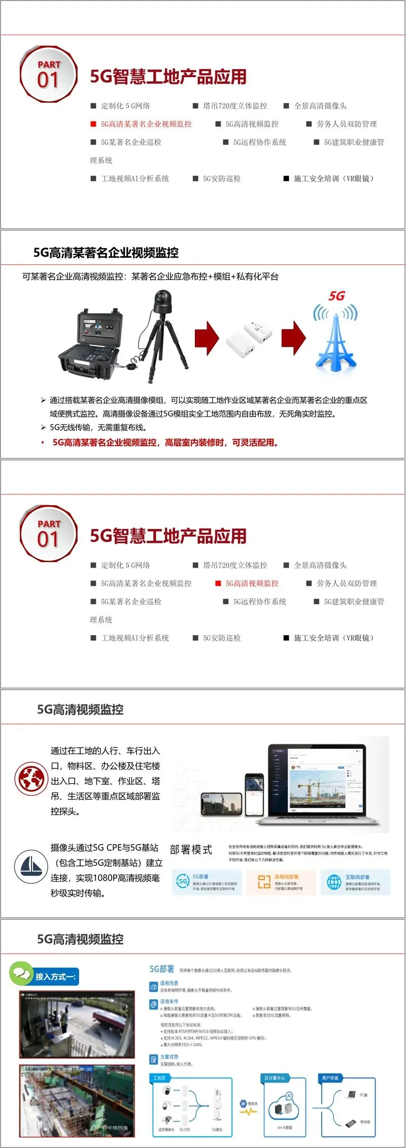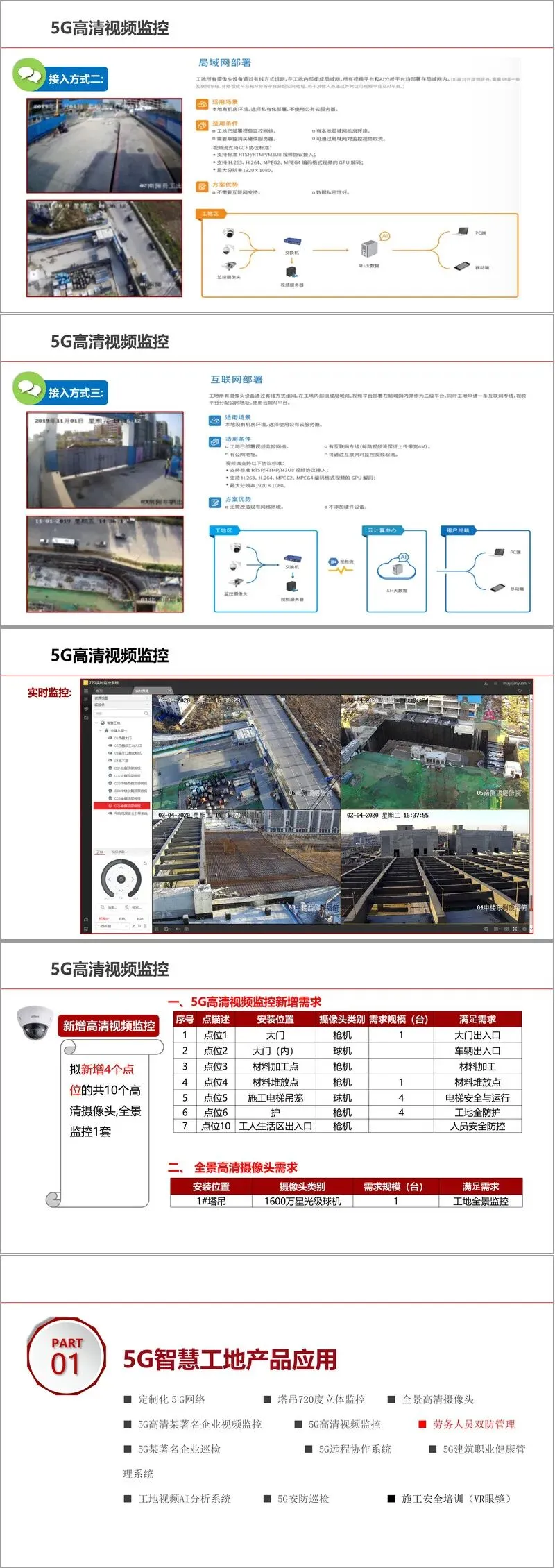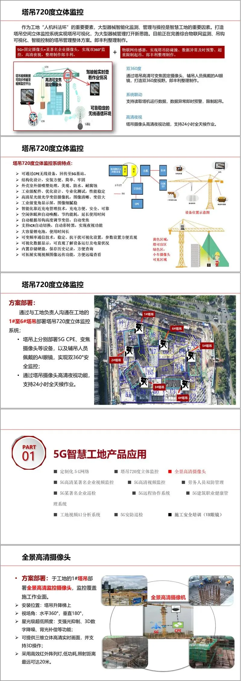 在具体应用层面,方案展示了一系列标志性5G智慧工地产品。例如,塔吊720度立体监控系统,通过5G CPE、高清可变焦摄像头与AI眼镜结合,实现双360度无死角监控,具备高清夜视、数据异常预警、防碰撞与超重限制等功能,极大提升了大型设备的安全管理水平。全景高清摄像头与5G高清视频监控系统,实现了对作业面、出入口、地下室等重点区域的全天候、高清化、实时化覆盖,并结合AI分析,实现安全着装识别、危险行为预警等智能监管。