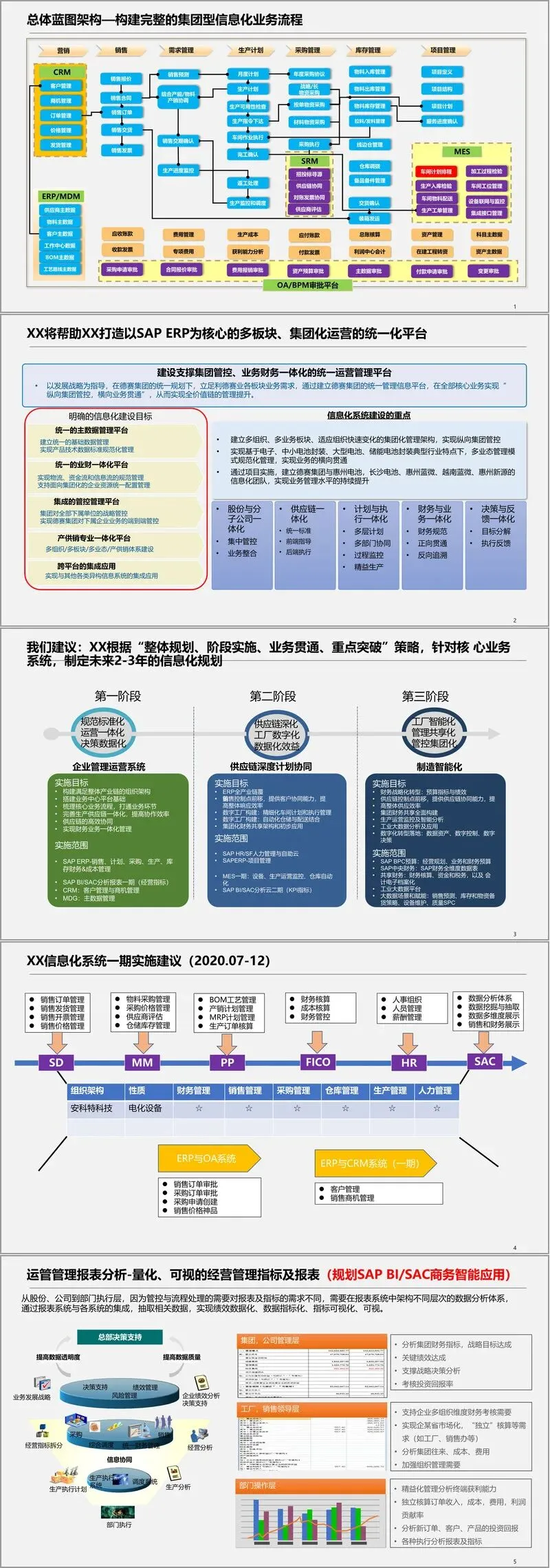 针对该集团的具体业务,方案提出了分阶段实施的总体蓝图。第一阶段聚焦于构建以SAP ERP为核心的一体化运营平台,覆盖销售、计划、采购、生产、库存、财务与成本管理,并初步建立数据分析体系与主数据管理基础。此阶段旨在打通核心业务流程,实现集团管控架构落地。第二阶段深化供应链协同与数字工厂建设,引入MES系统进行车间精细化管理和仓库自动化,同时扩展人力资源管理、项目管理及更深入的商务智能分析。第三阶段则致力于全面构建集团财务共享中心,推进供应链智能协同与工业大数据分析应用,最终实现数据资产化、决策数字化。