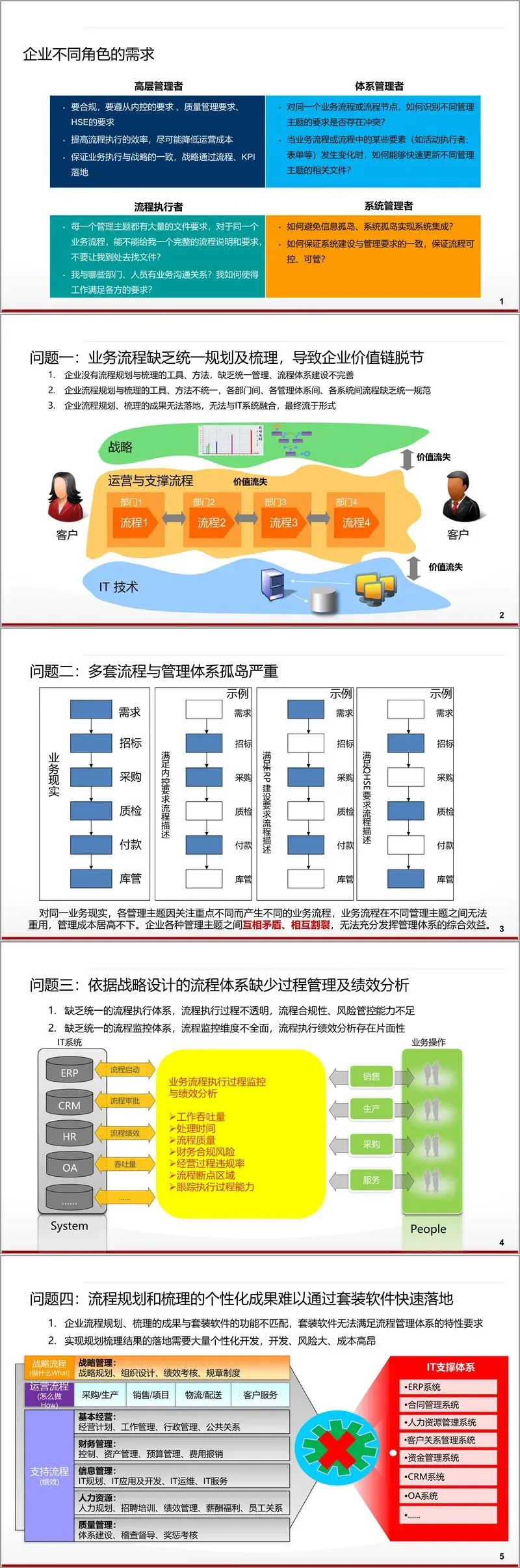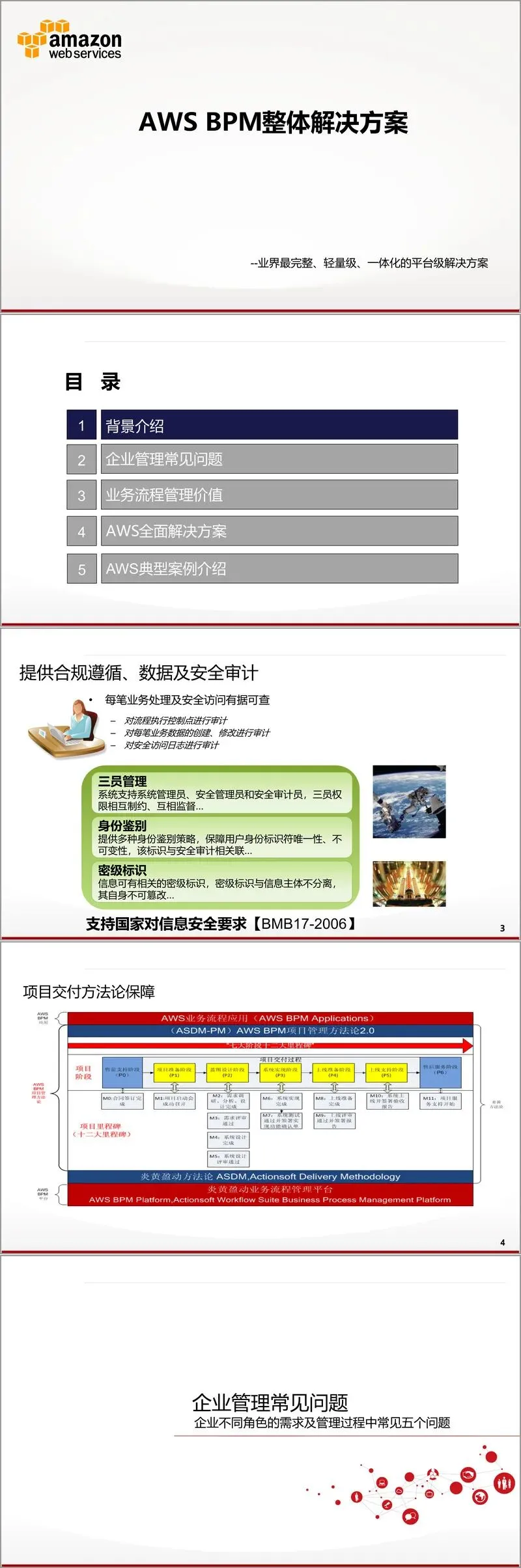 资料开篇即明确了AWS BPM的核心定位:致力于解决企业管理中普遍存在的流程难题。它尖锐地指出了企业面临的六大常见问题:业务流程缺乏统一规划导致价值链脱节;多套流程与管理体系形成孤岛,互相矛盾;依据战略设计的流程体系缺乏有效的过程管理与绩效分析;流程规划的个性化成果难以通过标准套装软件快速落地;流程分散在多个“竖井”系统中,缺乏统一入口和端到端的管理;以及管理者的诸多诉求无法得到有效的IT支撑。这些问题直击当下许多企业在规模化、多元化发展中遇到的治理痛点。
