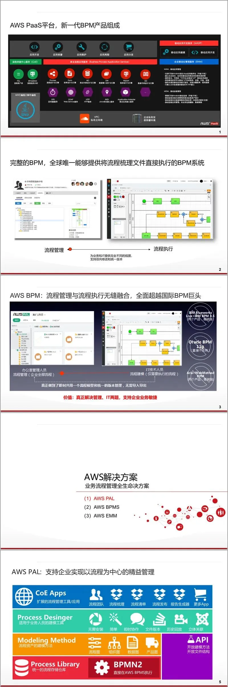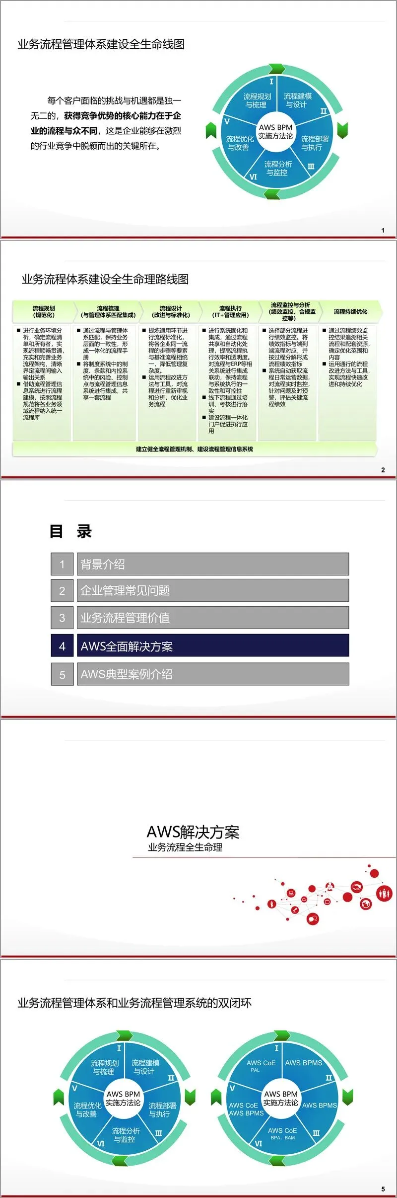 在清晰界定问题与价值后,资料全面展示了AWS的解决方案体系。该体系以业务流程全生命周期管理为主线,构建了“业务流程管理体系”和“业务流程管理系统”的双闭环。其核心依托是AWS PaaS平台,这是一个新一代的BPM产品组合,宣称是全球唯一能够实现将流程梳理文件直接执行的BPM系统。