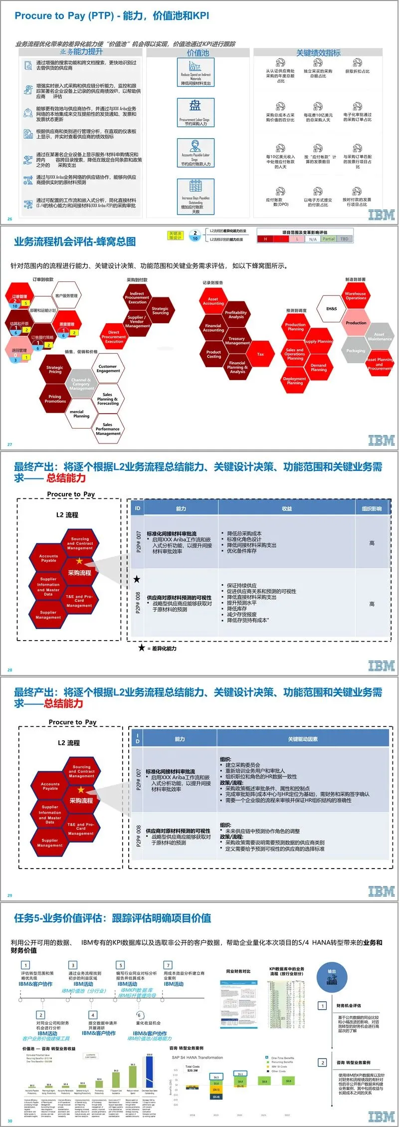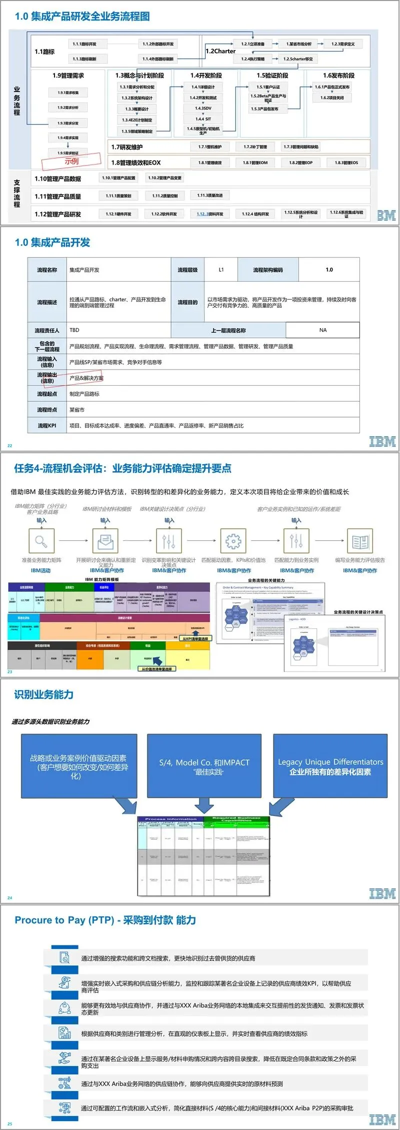 核心环节在于业务流程的全面梳理与机会识别。IBM借助其行业解决方案框架,构建涵盖从“集成产品开发”、“订单到交付”、“采购到付款”到“管理财务”、“管理人力资源”等的一级流程框架,并绘制清晰的流程关系图。在此基础上,通过业务能力评估,识别如“采购到付款”等关键流程的差异化能力提升点,并量化其能带来的“价值池”机会,将业务优化与财务收益直接挂钩。