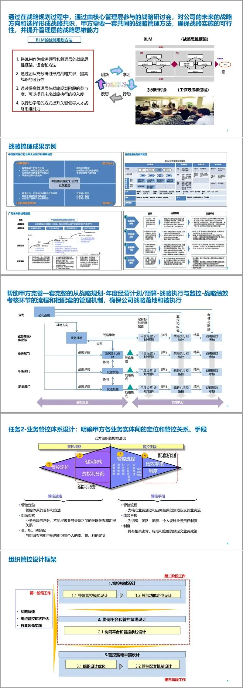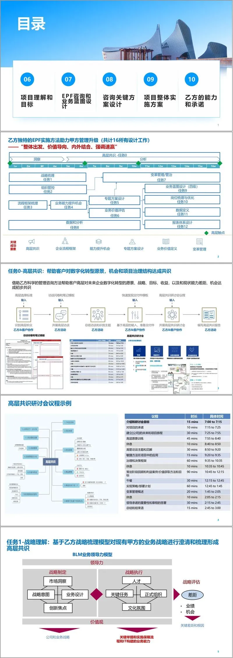 该方法论涵盖共计16项核心任务,形成一套环环相扣的咨询与实施体系。项目从达成“高层共识”开始,确保数字化转型的愿景与目标获得一致认同。随后,运用BLM(业务领导力模型)进行“战略梳理”,将公司战略层层分解为可执行的业务设计与关键任务。