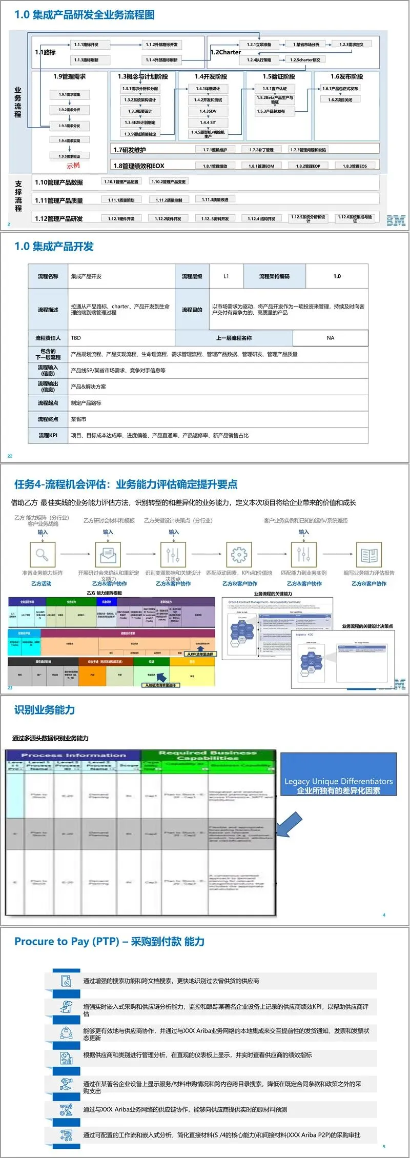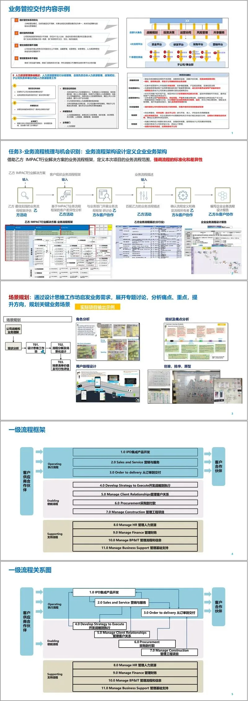 在“业务管控体系设计”阶段,方案明确了集团内各业务实体的定位、管控关系与手段,涵盖组织架构、责权利分配、管控流程及配套绩效考核机制。紧接着,借助IBM的IMPACT行业解决方案框架,进行“业务流程梳理与机会识别”,定义了从集成产品开发(IPD)、订单到交付(OTD)、采购到付款(PTP)等一级流程框架,并逐级细化,厘清流程间的逻辑关系。