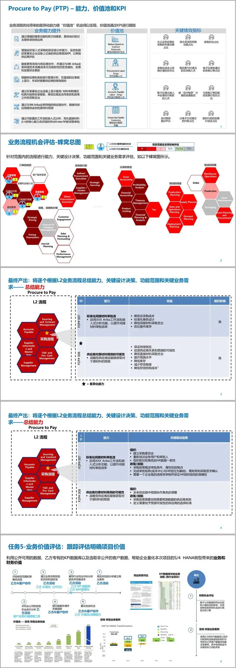 “流程机会评估”与“业务价值评估”是量化项目收益的关键环节。方案通过业务能力矩阵,识别差异化能力与提升要点,并将其与具体的价值池(如节约采购人力、降低间接材料支出、增加应付账款天数等)和KPI挂钩。利用专业的对标分析工具,量化了关键绩效指标微小改进所能带来的巨额现金流收益,为项目商业案例提供了坚实的数据支撑。