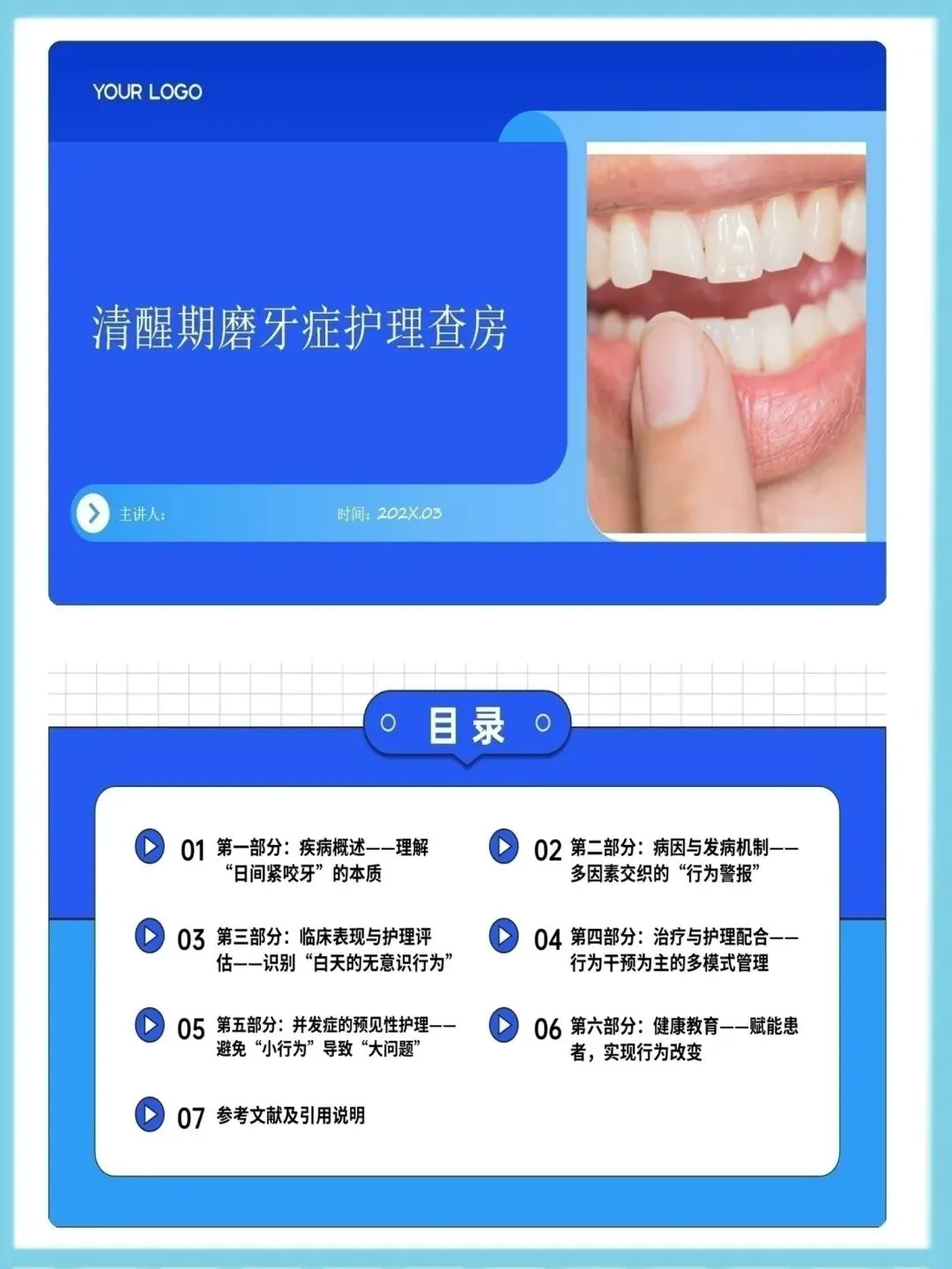 🌼名称:清醒期磨牙症护理查房带参考文献ppt模板