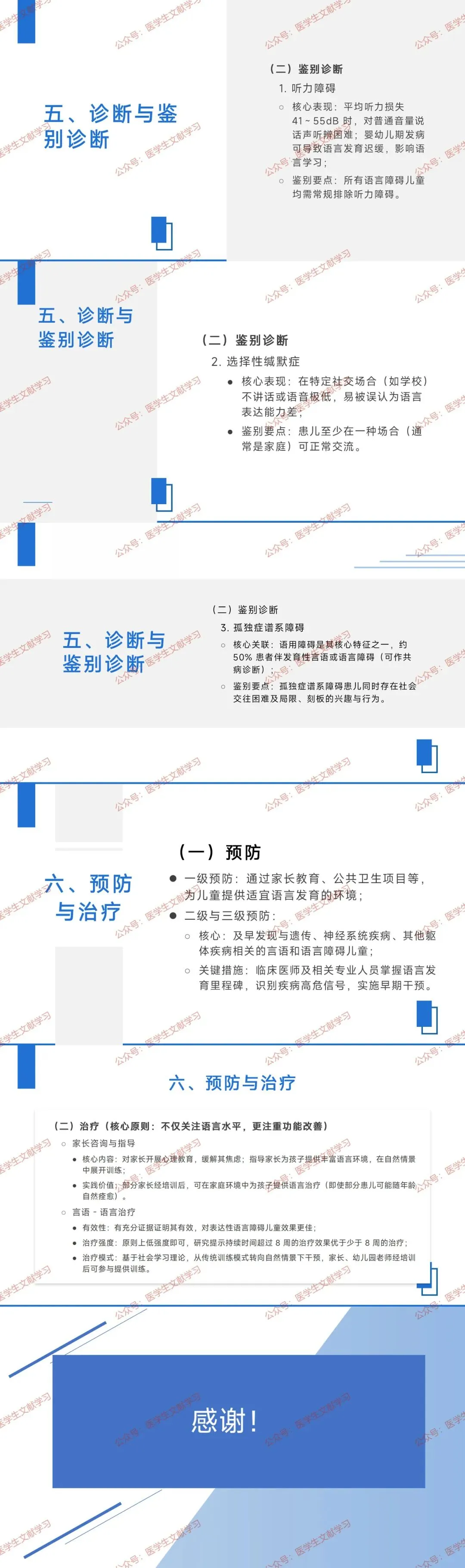 关键措施:临床医师及相关专业人员需熟练掌握儿童语言发育里程碑,准确识别疾病高危信号(如 2 岁仍不会说简单词语),并及时实施早期干预。