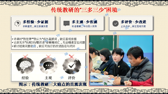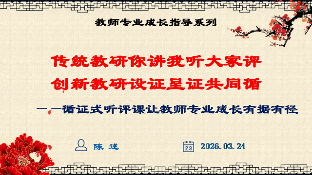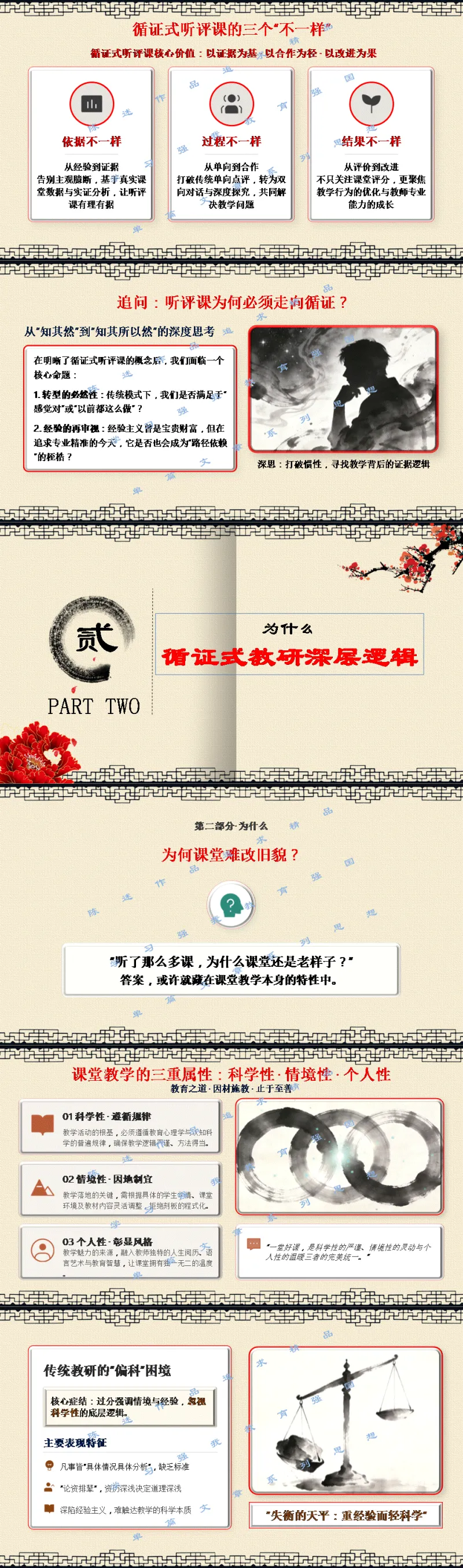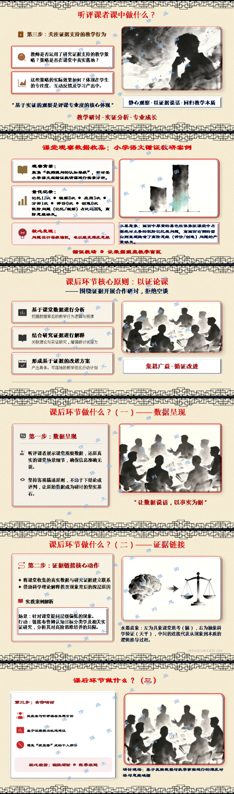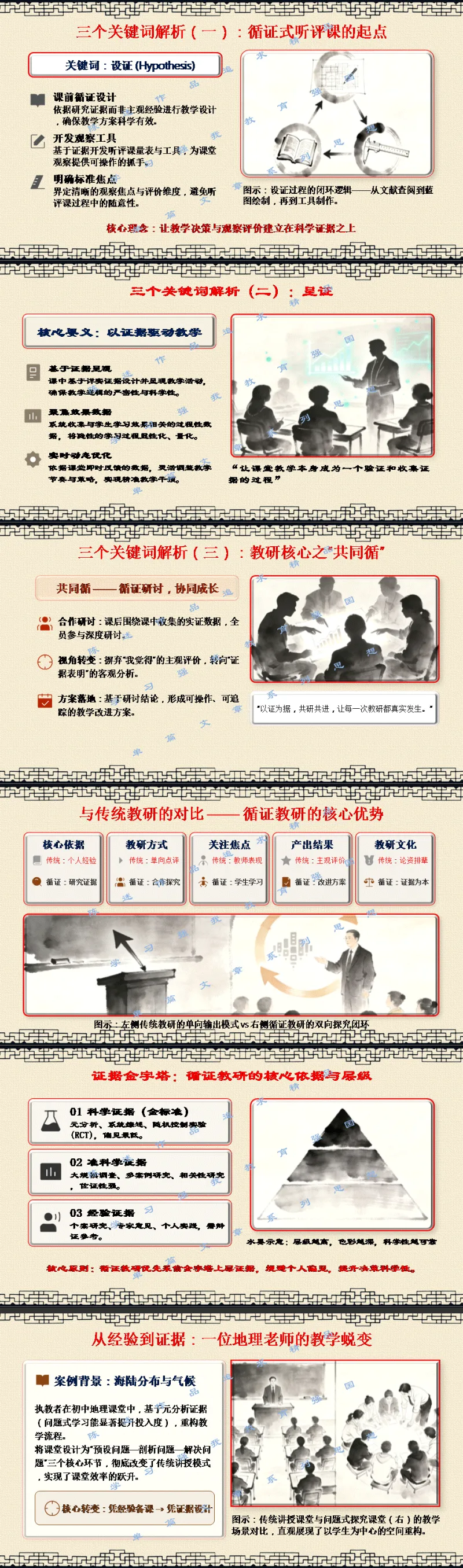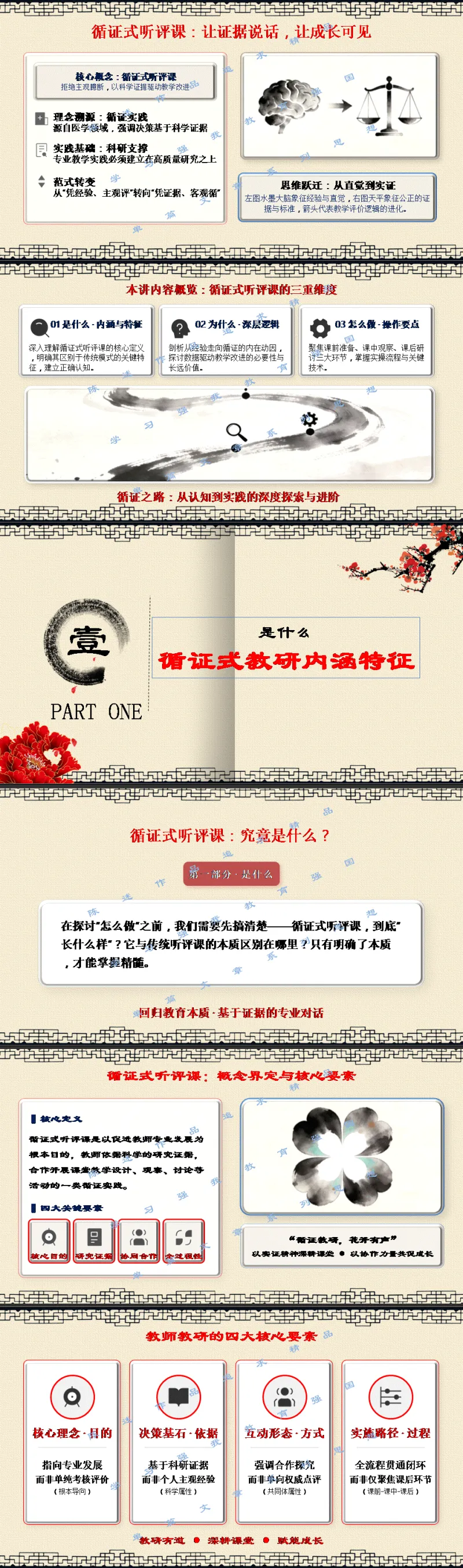 选择关注,关注陈述教学公众号,能力会提高。文末阅读一线校长更多原创内容。阅读提示:传统教研中,听评课往往依赖个人经验,陷入“我觉得”“我认为”的主观评价,重经验轻证据、重评价轻改进,导致研讨热闹却难有实效——大家各说各话,问题依旧,教师成长缓慢。从《【教研培训PPT】深耕常规课 做实真教研》到《【教研培训PPT】直面真问题 深化新教研》,我们一步步探寻教研的实效与深度。而今,《传统教研你讲我听大家评,创新教研设证呈证共同循》将教研改革推向核心——让“经验”与“证据”握手,让“评价”与“改进”同行。本课件聚焦循证式听评课,提供一套可操作、可复制的实践路径,助您从“我觉得”走向“证据表明”,让每一次听评课都成为教师专业成长的有力支点。