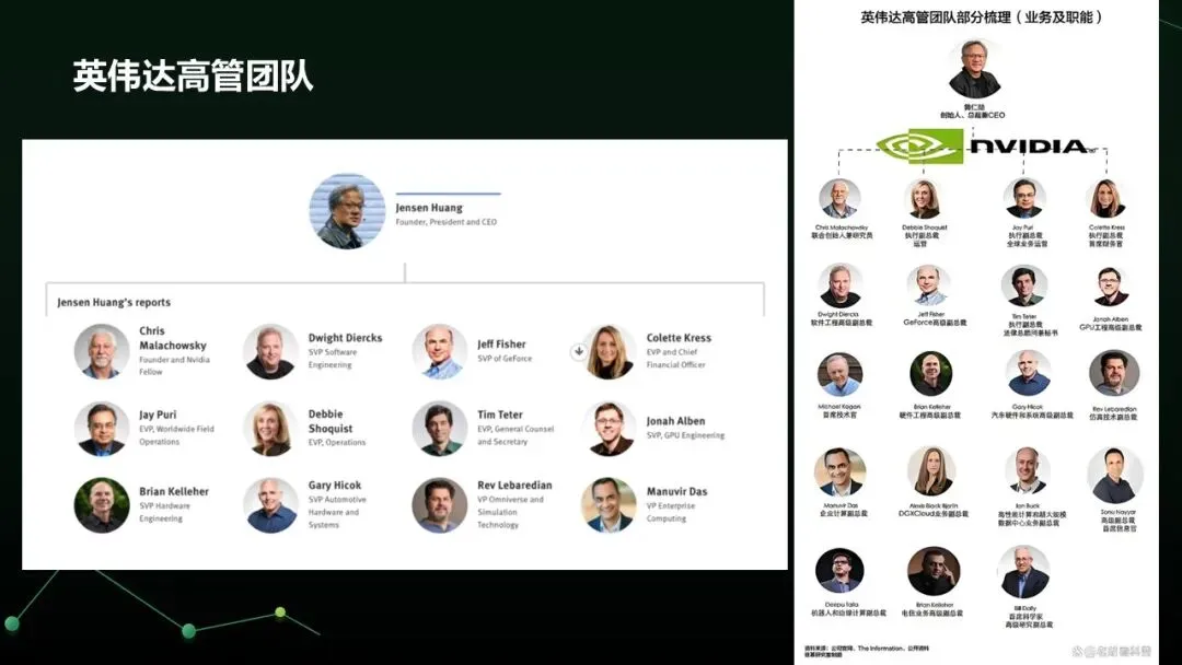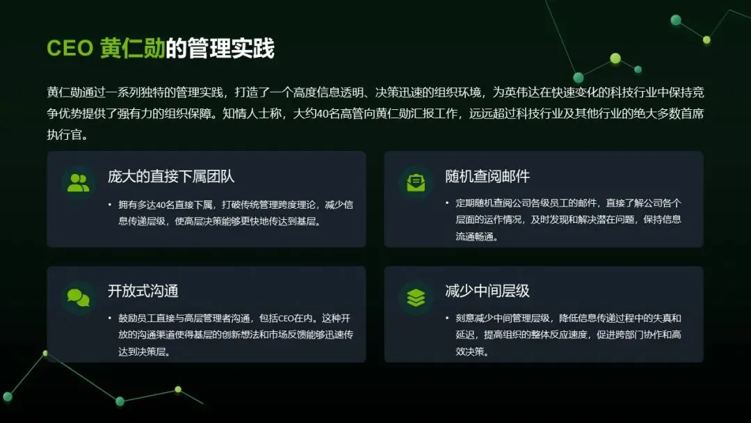 极致扁平:CEO 黄仁勋直接管理约 40 名下属,减少层级与信息失真。