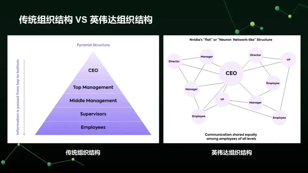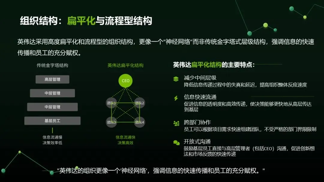 英伟达颠覆传统科层制,采用高度扁平化与流程型结构(自称 "神经网络"),核心特点有如下几点: