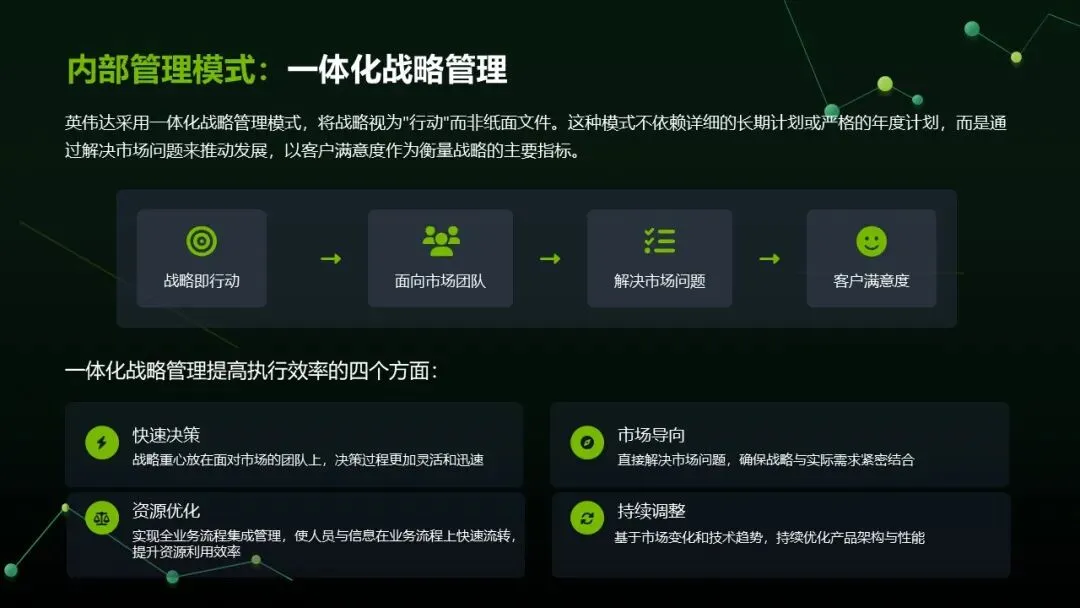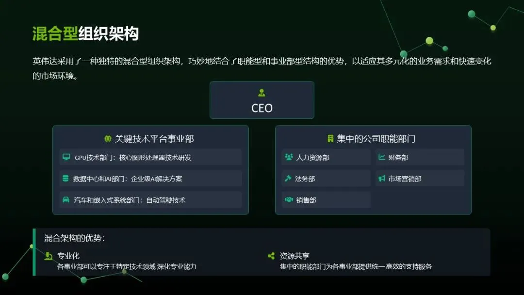混合架构:融合职能型(HR、财务)与事业部型(GPU 技术、数据中心 AI 等),平衡专业深耕与资源共享。