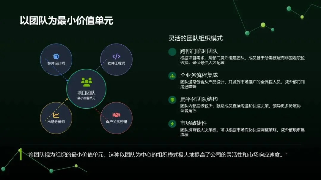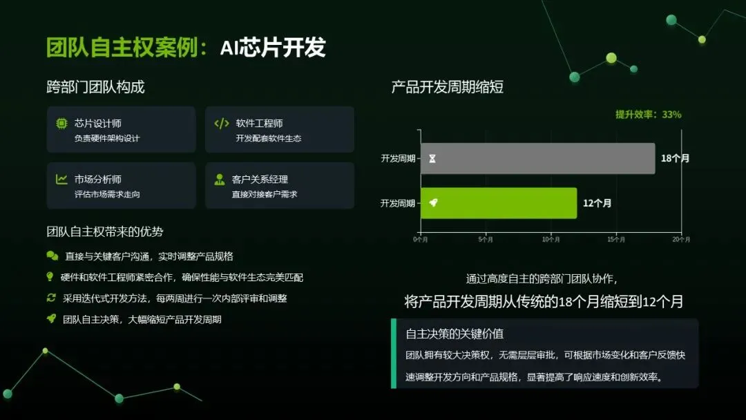 动态协作:跨职能团队按需组建(如芯片设计 + 软件 + 市场),赋予自主权,产品开发周期从 18 个月缩至 12 个月。