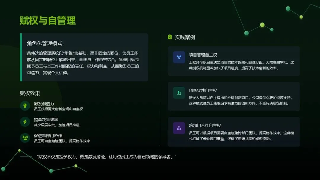 深度赋权:按 "角色" 而非固定职位管理,工程师自主决定技术路线,研发者自由推进项目,激发创造力。
