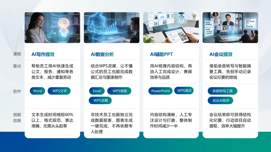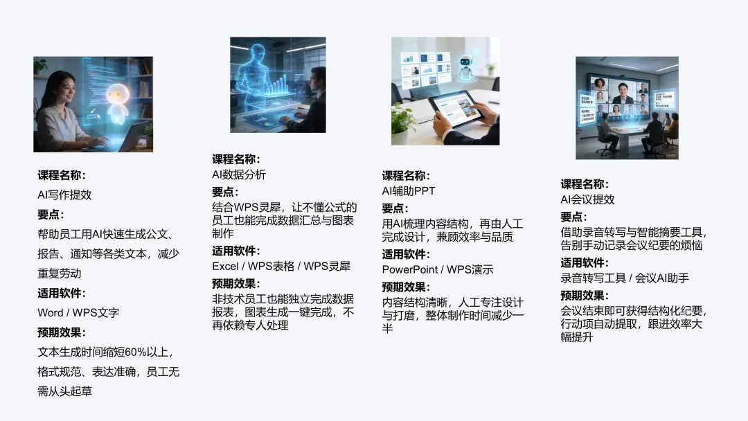 我看了一下,每个模块都有相同的文本:课程名称、要点、适用软件、预期效果。这类的文本,最清晰的排版方法,就是把这些类似于表格标签的文本,放在最左侧,右侧再分别对应四个模块。