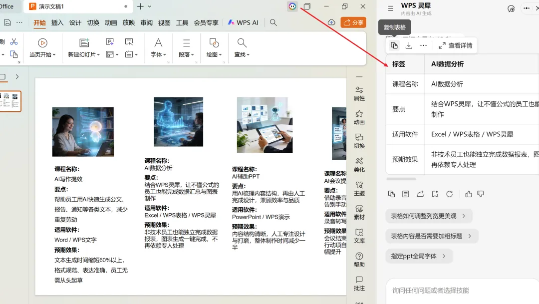 如果你平常用的是WPS Office,直接在当前页面点击顶部的“WPS灵犀”的图标,在右侧发送指令。AI直接输出了我想要的表格格式。我把这个表格复制到PPT里,以行列结构为基准排版,对齐问题迎刃而解。