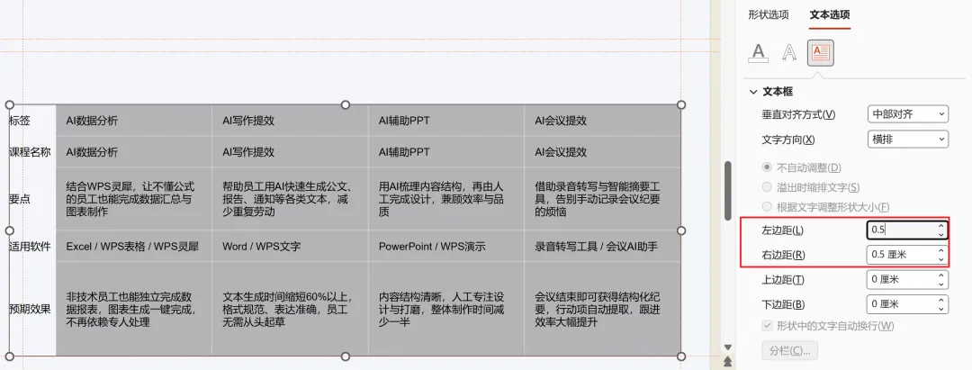 因为是表格,调整行高、列宽就非常简单,不像之前的文本框要一个一个调整,可以批量修改。为了让每列之间有一定的间距,可以修改单元格的左右边距。
