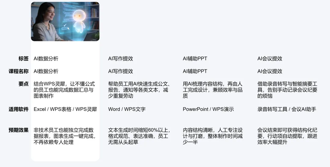 "请帮我转成5列的表格,左侧是标签(课程名称、要点、适用软件、预期效果),后4列是四个课程模块对应的具体内容。"