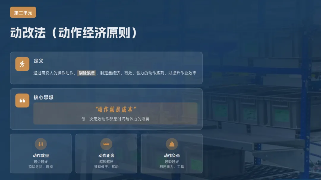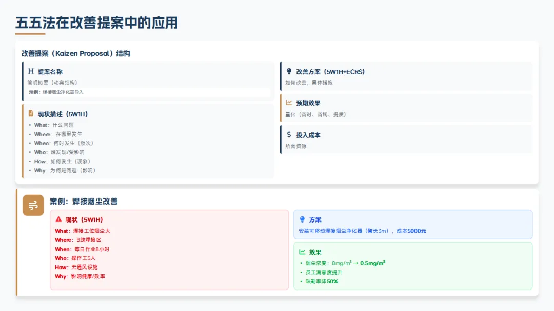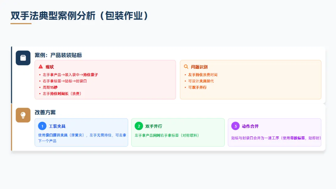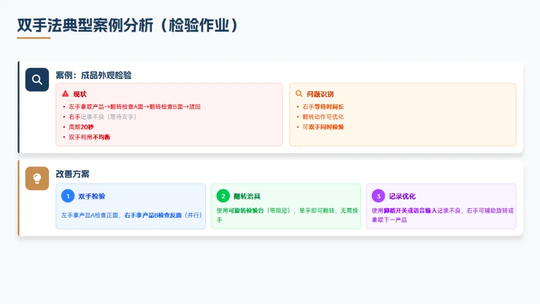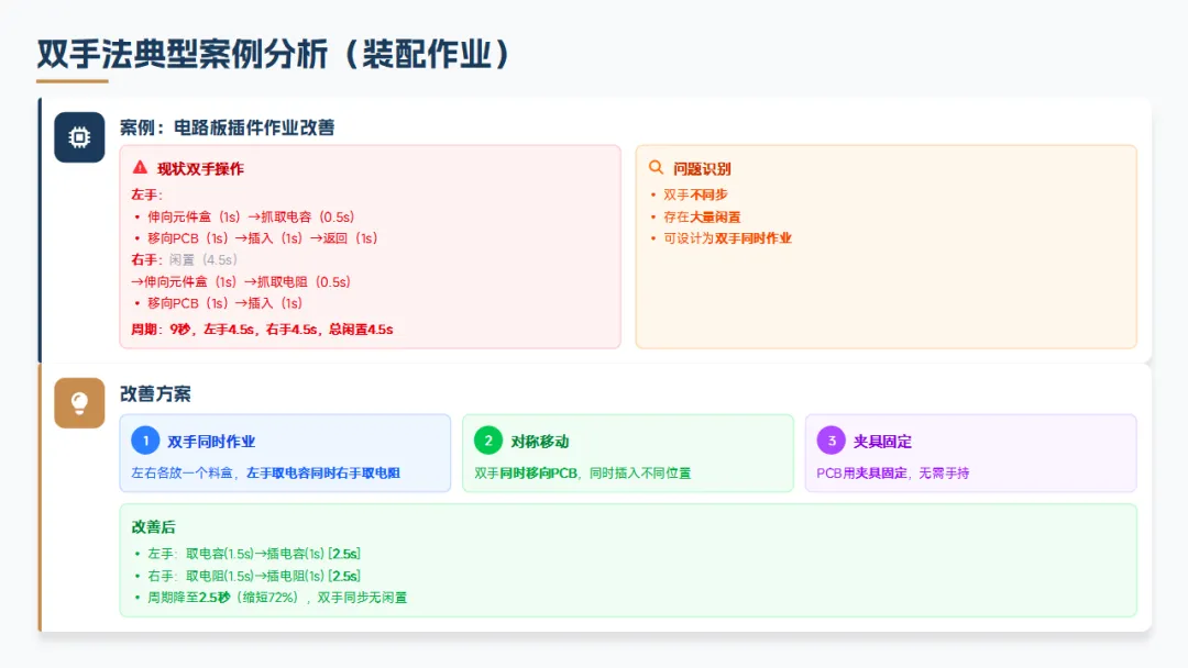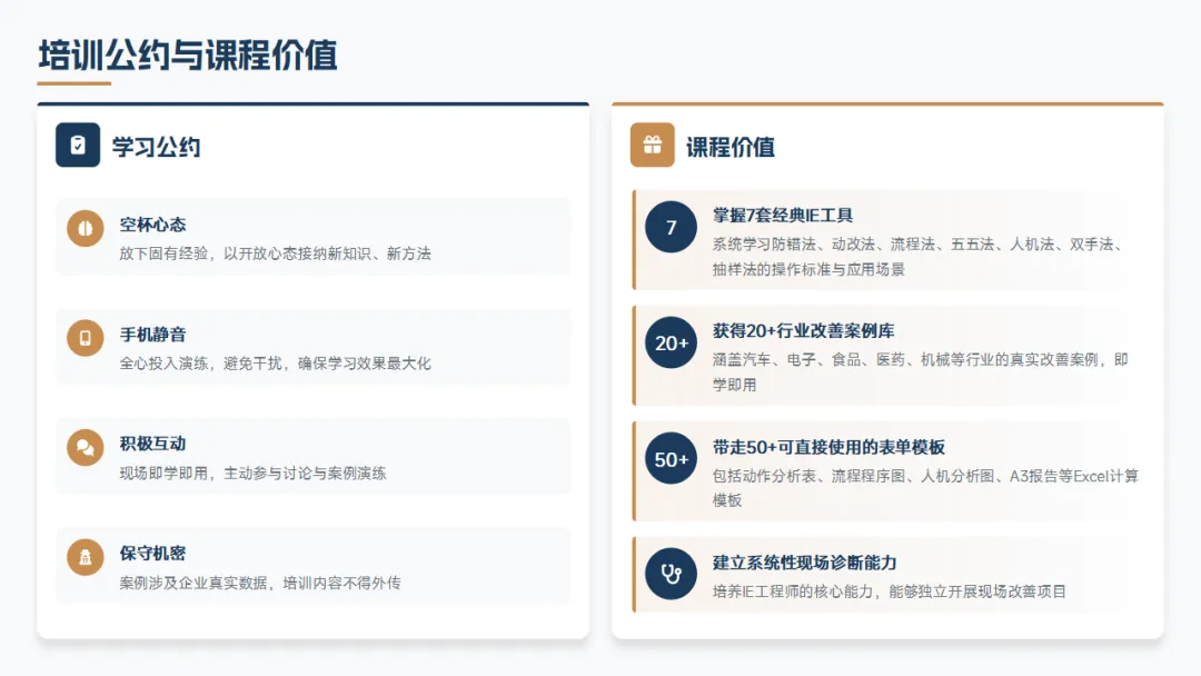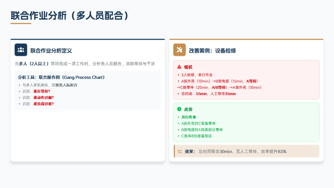 改善前后必有数据对比。时间、距离、次数、金额,用数据证明改善效果,避免主观判断。"我觉得快了"不行,必须说"从45秒降到28秒,效率提升38%"。这是IE的专业性所在。