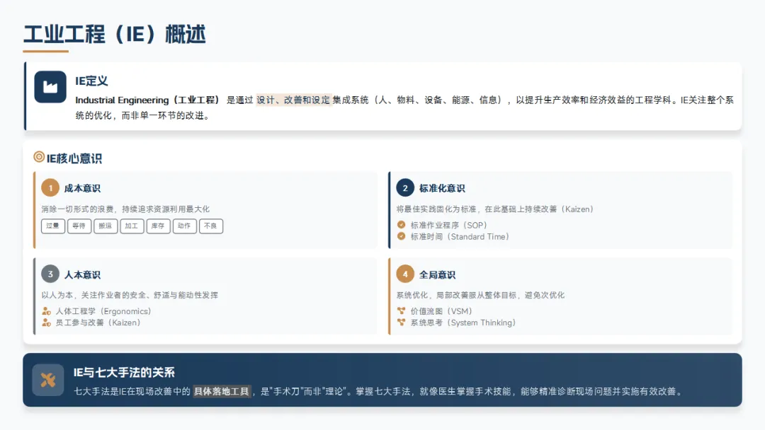 在正式进入七大手法之前,我们需要先建立对工业工程的整体认知。这个单元我们会回答三个问题:什么是IE?IE的核心意识是什么?七大手法在IE体系中处于什么位置?
