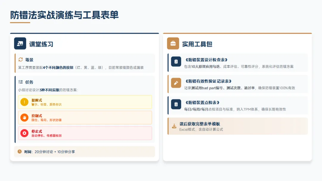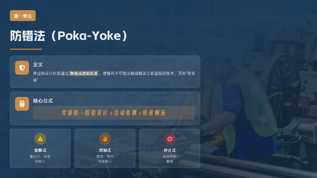 欢迎进入第一大战术单元——防错法。防错法是七大手法中唯一一个聚焦于"质量预防"的工具,其他手法主要聚焦效率提升,而防错法兼顾质量与效率。我们常说"质量是设计出来的,不是检验出来的",防错法就是这句话的最佳实践。