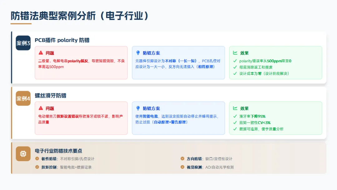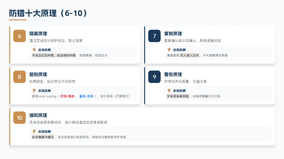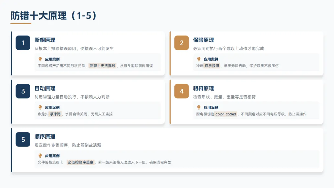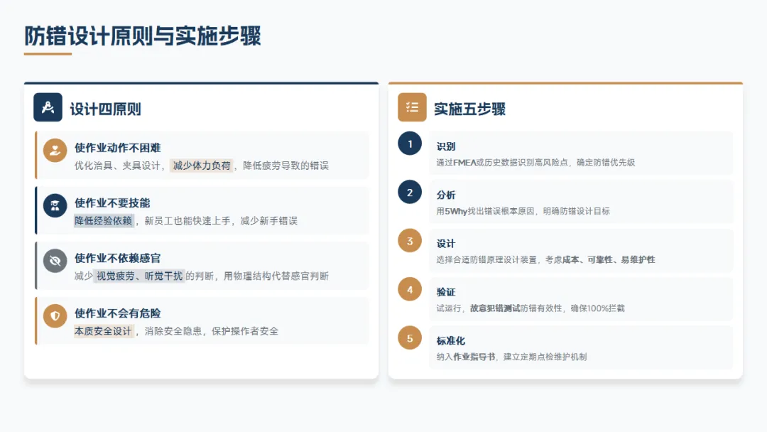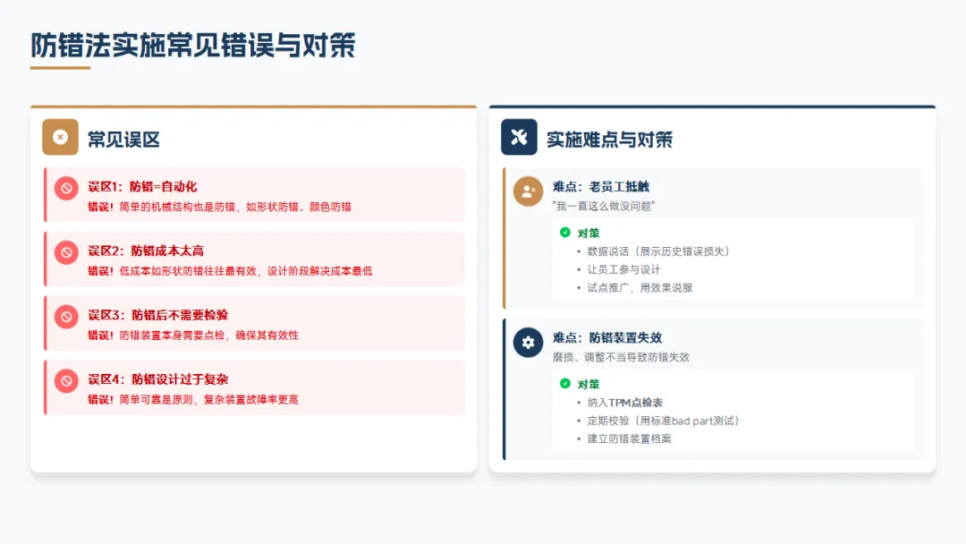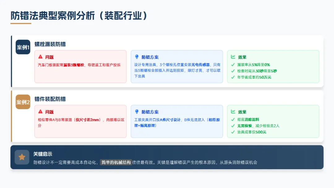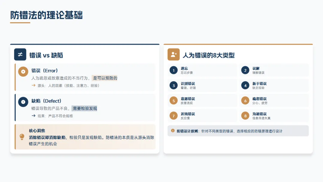 。防错不是在问题发生后去检验,而是在设计阶段就预防。检验只能发现缺陷,防错才能预防缺陷。
