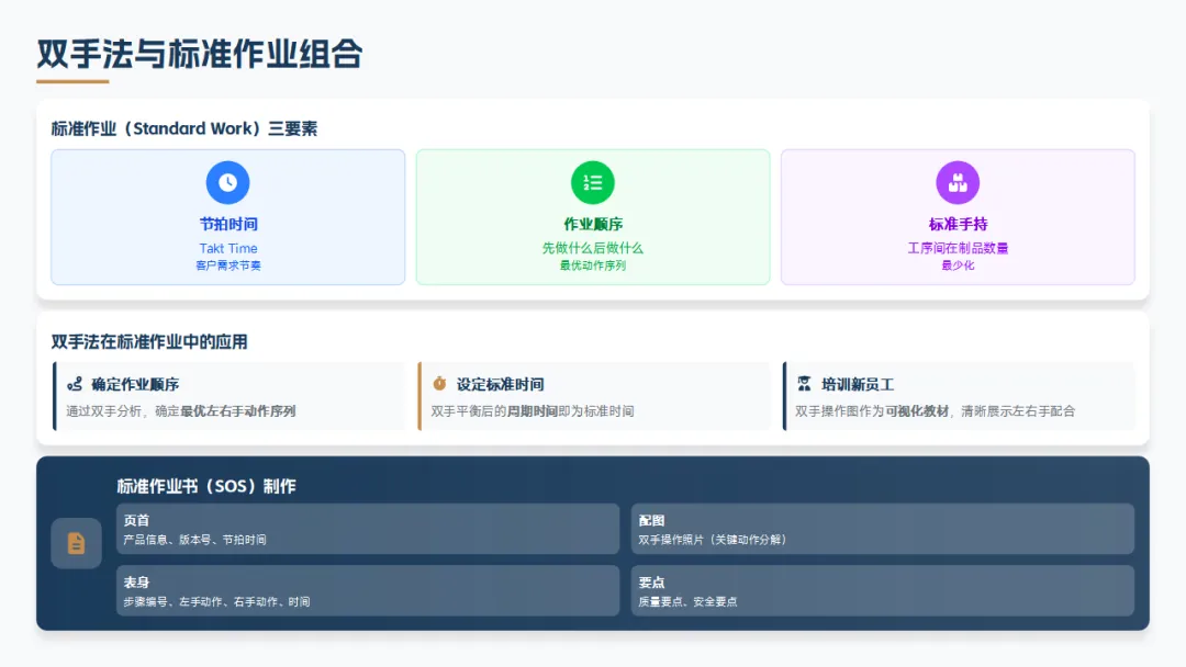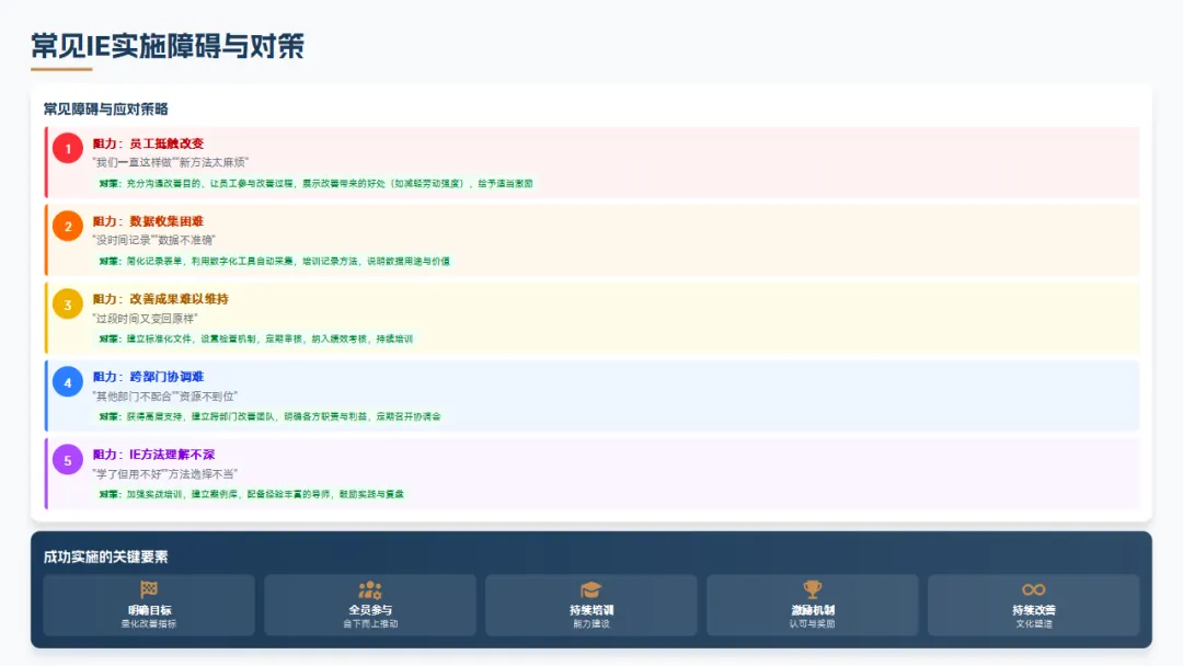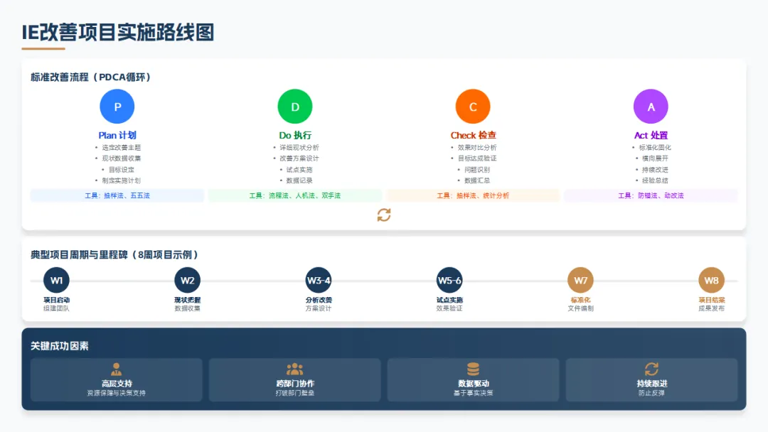 改善的成果如果不能维持,就会很快回到原点。因此,IE强调标准化。将当前最佳的操作方法固化为标准作业程序(SOP),在此基础上持续改善(Kaizen)。标准化不是终点,而是改善的起点。