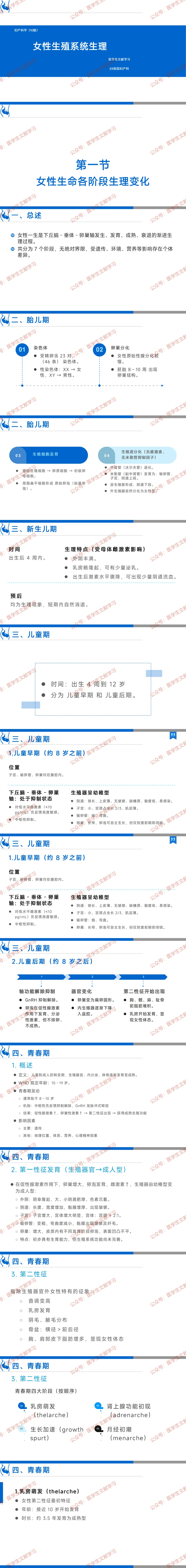 女性一生是下丘脑 - 垂体 - 卵巢轴发生、发育、成熟、衰退的渐进过程,共分为 7 个阶段,阶段间无绝对界限,受遗传、环境、营养等影响存在个体差异。