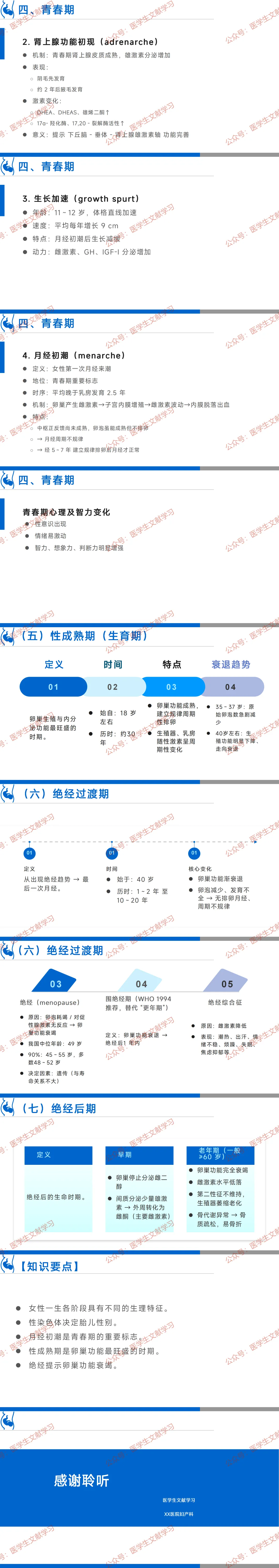 - 绝经:卵巢功能衰竭,我国中位年龄 49 岁,多发生于 45~55 岁。