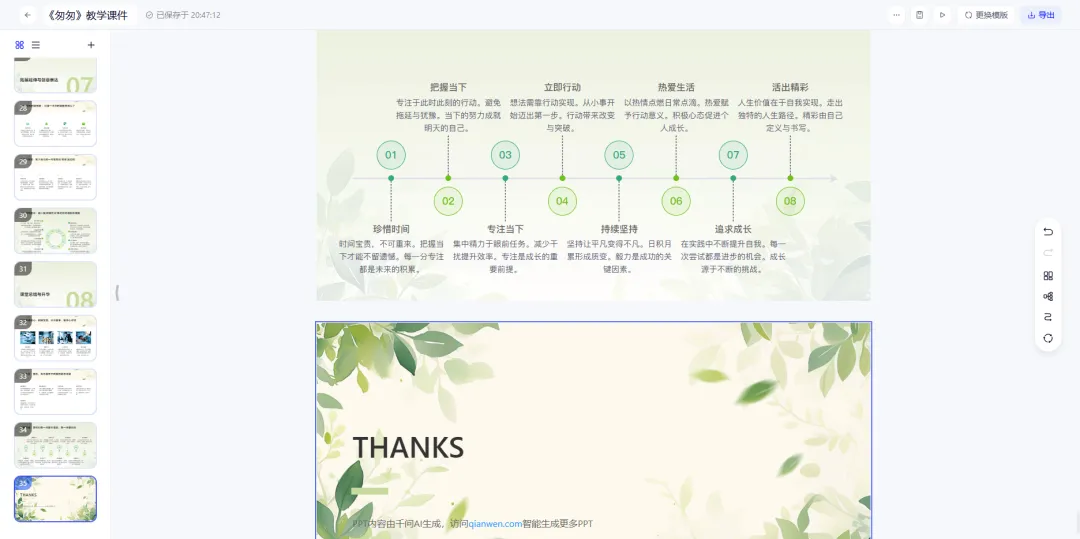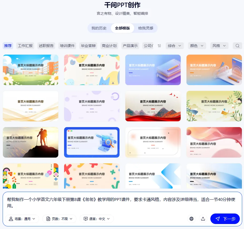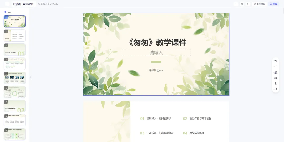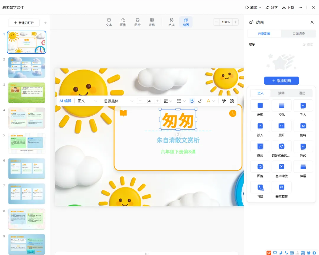 实操案例:让它们都来生成小学语文6年级下册第8课《匆匆》的课件。