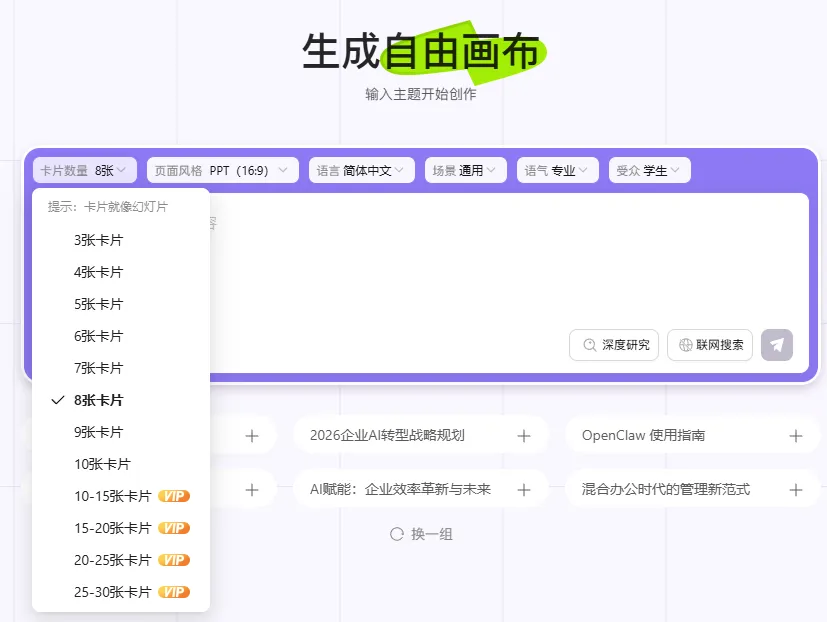 选择智能布局,自由风格,自动页数,全权交给KIMI让它自由发挥,看它能做出个什么样的PPT。