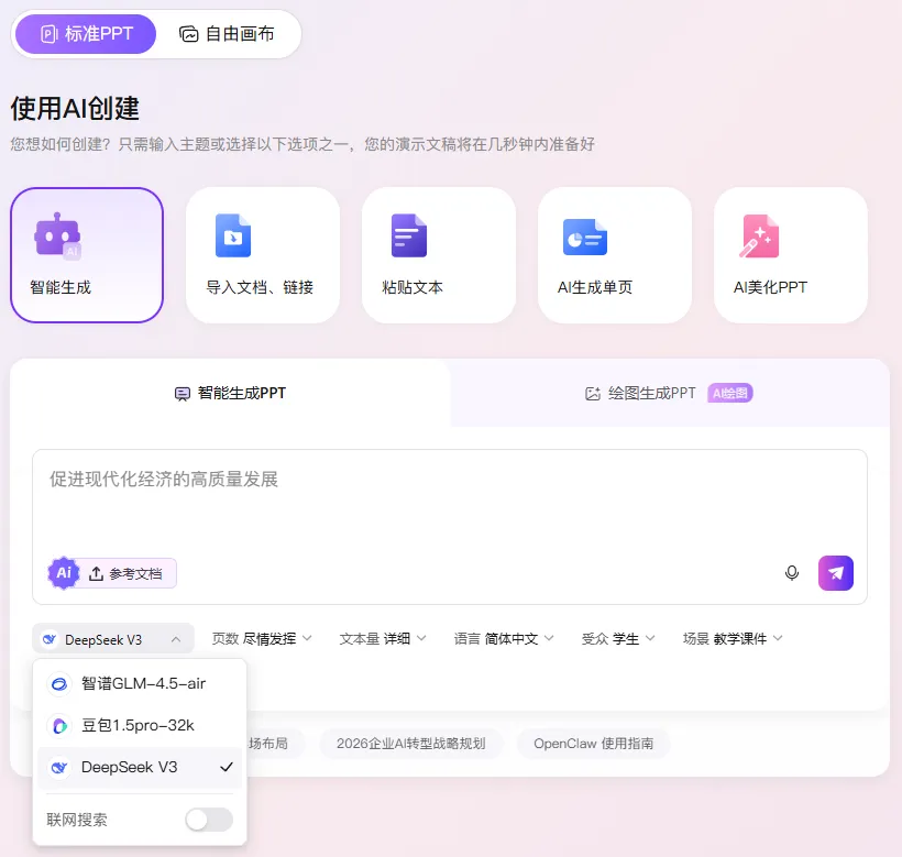 改为选用生成标准PPT,选择智能生成,点开后看到它调用的也有豆包模型,算了,为了区分开效果我选择DeepSeek V3试试。