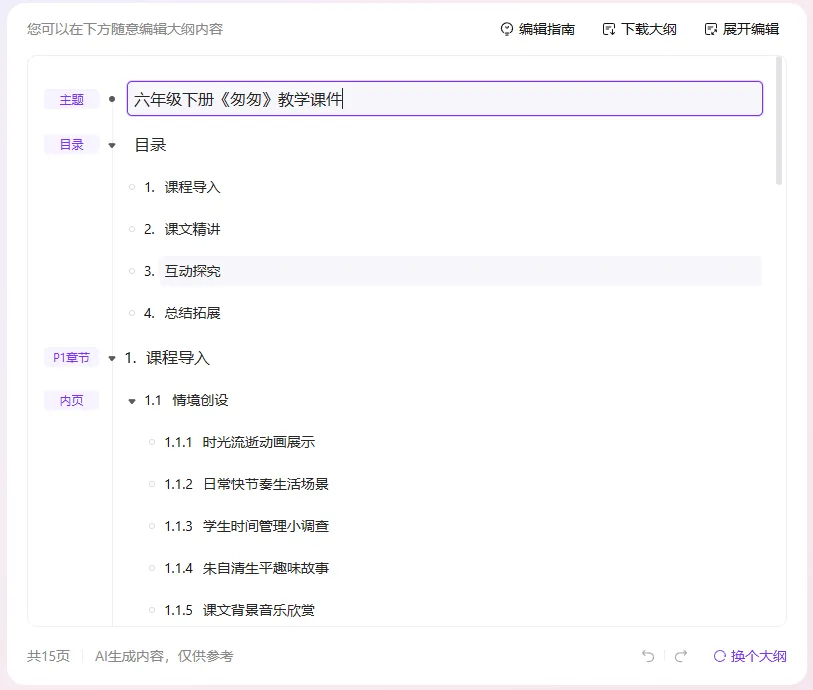 先生成了15页的大纲~~
