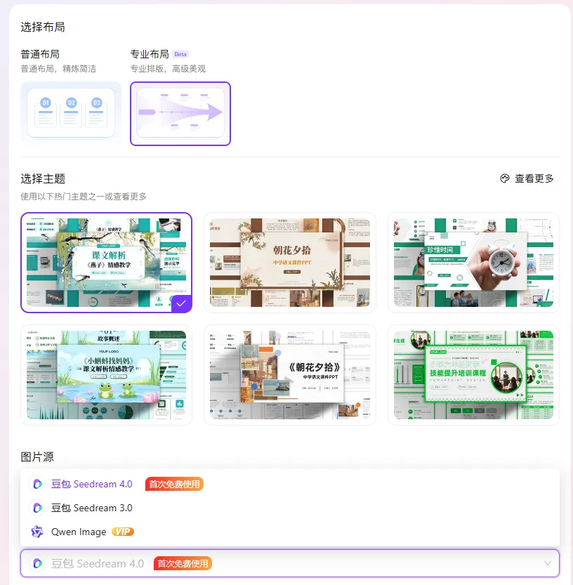 生成的时候分为普通布局和专业布局,选用专业布局时可以选择豆包和阿里的Qwen,但阿里的需要开会员,豆包我也不想再测试了,直接终止吧。