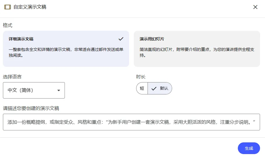 选择交给它尽情发挥、受众是学生、场景是教学课件,这样一看还是挺靠谱的,具体还是让它生成看看吧。