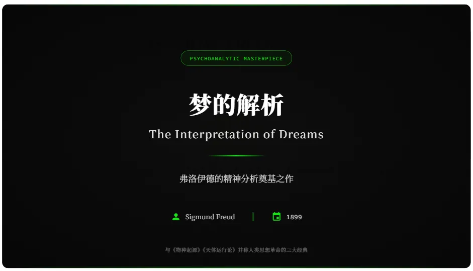 西格蒙德·弗洛伊德的《梦的解析》(1899)被誉为精神分析学的奠基之作,与达尔文的《物种起源》、哥白尼的《天体运行论》并称“导致人类思想革命的三大经典著作”。它不仅重构了人类对梦境的理解,更通过解析梦的机制揭示了潜意识的运作规律,对心理学、哲学、文学等领域产生了深远影响。