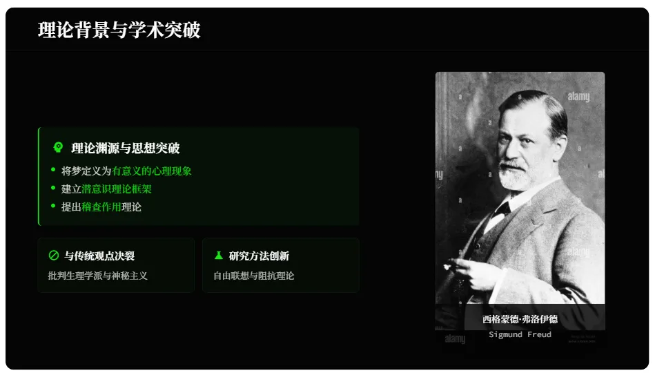 《梦的解析》的突破性在于:将梦定义为有意义的心理现象,建立潜意识理论框架,提出“稽查作用”理论。